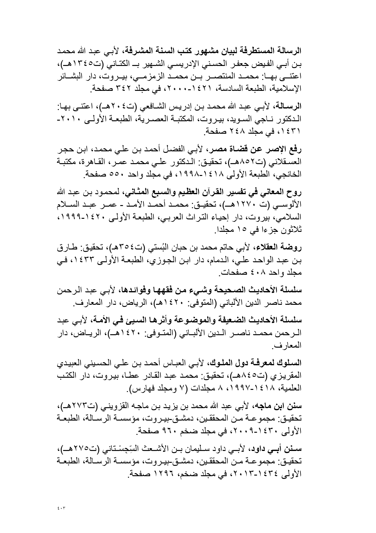 سنن ابن ماجه، لأبي عبد الله محمد بن يزيد بن ماجه القزويني (ت 273 هـ)، تحقيق: مجموعة من المحققين، دمشق-بيروت، مؤسسة الرسالة، الطبعة الأولى 1430 - 2009، في مجلد ضخم 960 صفحة.