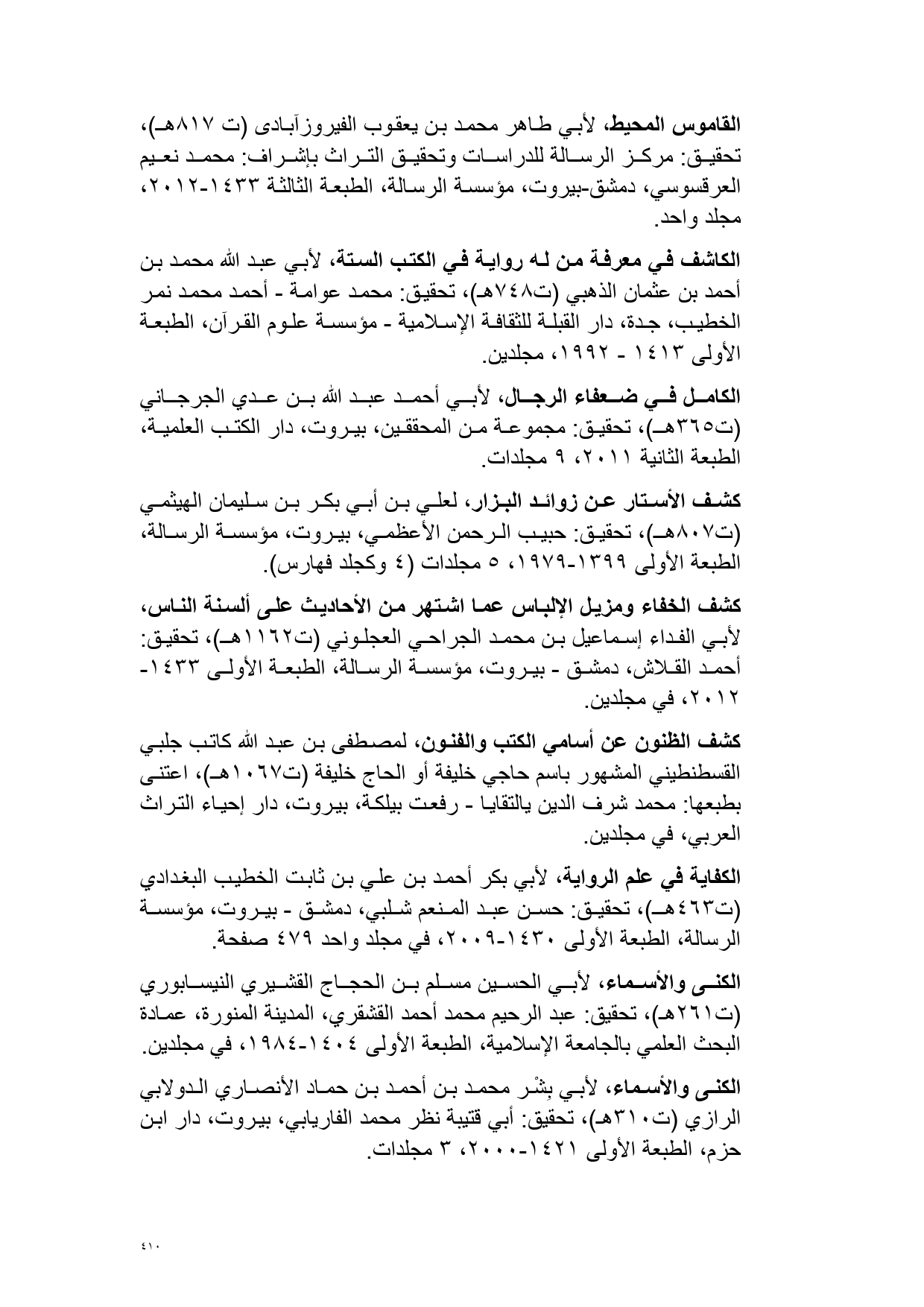 القاموس المحيط، لأبي طاهر محمد بن يعقوب الفيروزآبادى (ت 817 هـ)، تحقيق: مركز الرسالة للدراسات وتحقيق التراث بإشراف: محمد نعيم العرقسوسي، دمشق-بيروت، مؤسسة الرسالة، الطبعة الثالثة 1433 - 2012، مجلد واحد.
