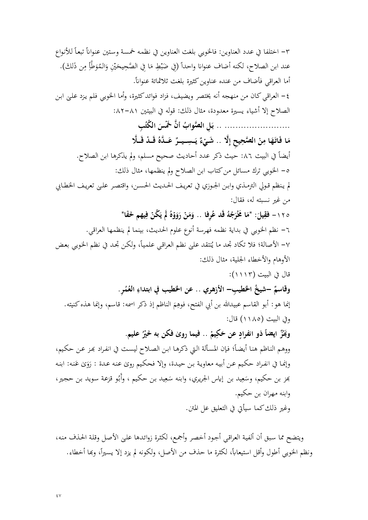 4 - العراقي كان من منهجه أنه يختصر ويضيف، فزاد فوائد كثيرة، وأما الخويي فلم يزد على ابن الصلاح إلا أشياء يسيرة معدودة، مثال ذلك: قوله في البيتين 81 - 82:
