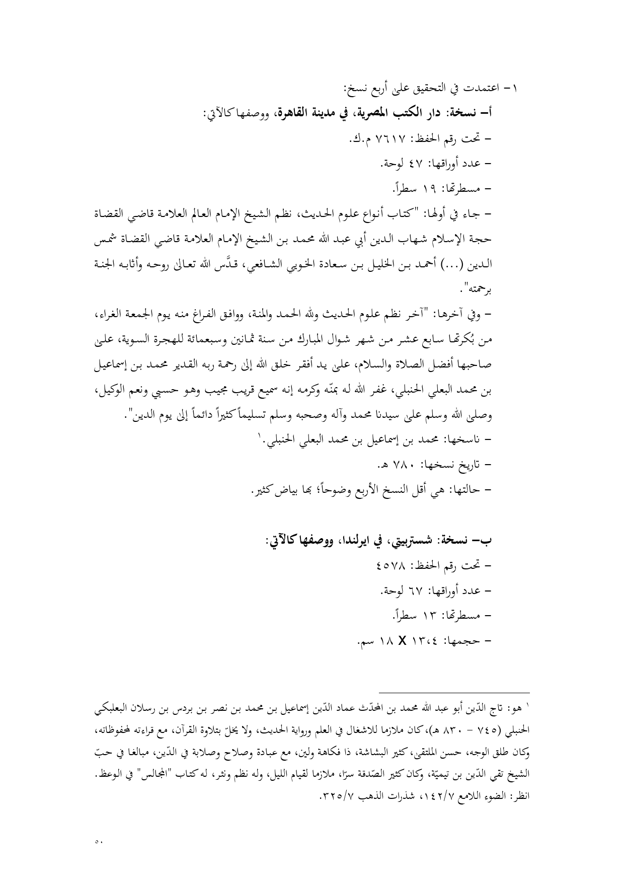 - جاء في أولها: "كتاب أنواع علوم الحديث، نظم الشيخ الإمام العالم العلامة قاضي القضاة حجة الإسلام شهاب الدين أبي عبد الله محمد بن الشيخ الإمام العلامة قاضي القضاة شمس الدين ( ... ) أحمد بن الخليل بن سعادة الخويي الشافعي، قدَّس الله تعالى روحه وأثابه الجنة برحمته".
