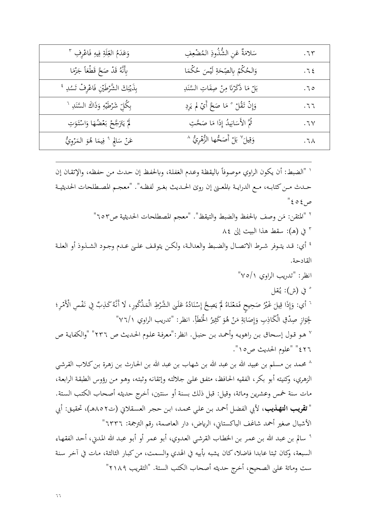 63 - سَلامَةٌ عَنِ الشُّذُوذِ المُضْعِفِ ... وَعَدَمُ العِّلَةِ فِيهِ فَاعْرِفِ (¬1)