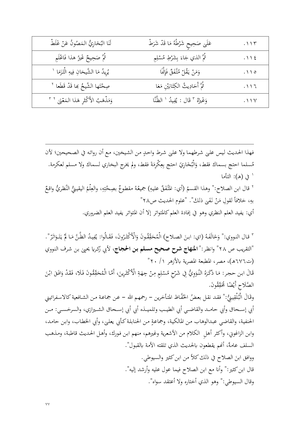 (¬3) قال النووي: " وَخَالَفَهُ (اي: ابنَ الصلاح) الْمُحَقِّقُونَ وَالْأَكْثَرُونَ، فَقَالُوا: يُفِيدُ الظَّنَّ مَا لَمْ يَتَوَاتَرْ". "التقريب ص 28" وانظر: " المنهاج شرح صحيح مسلم بن الحجاج، لأبي زكريا يحيى بن شرف النووي (ت 676 هـ)، مصر، المطبعة المصرية بالأزهر 1/ 20"