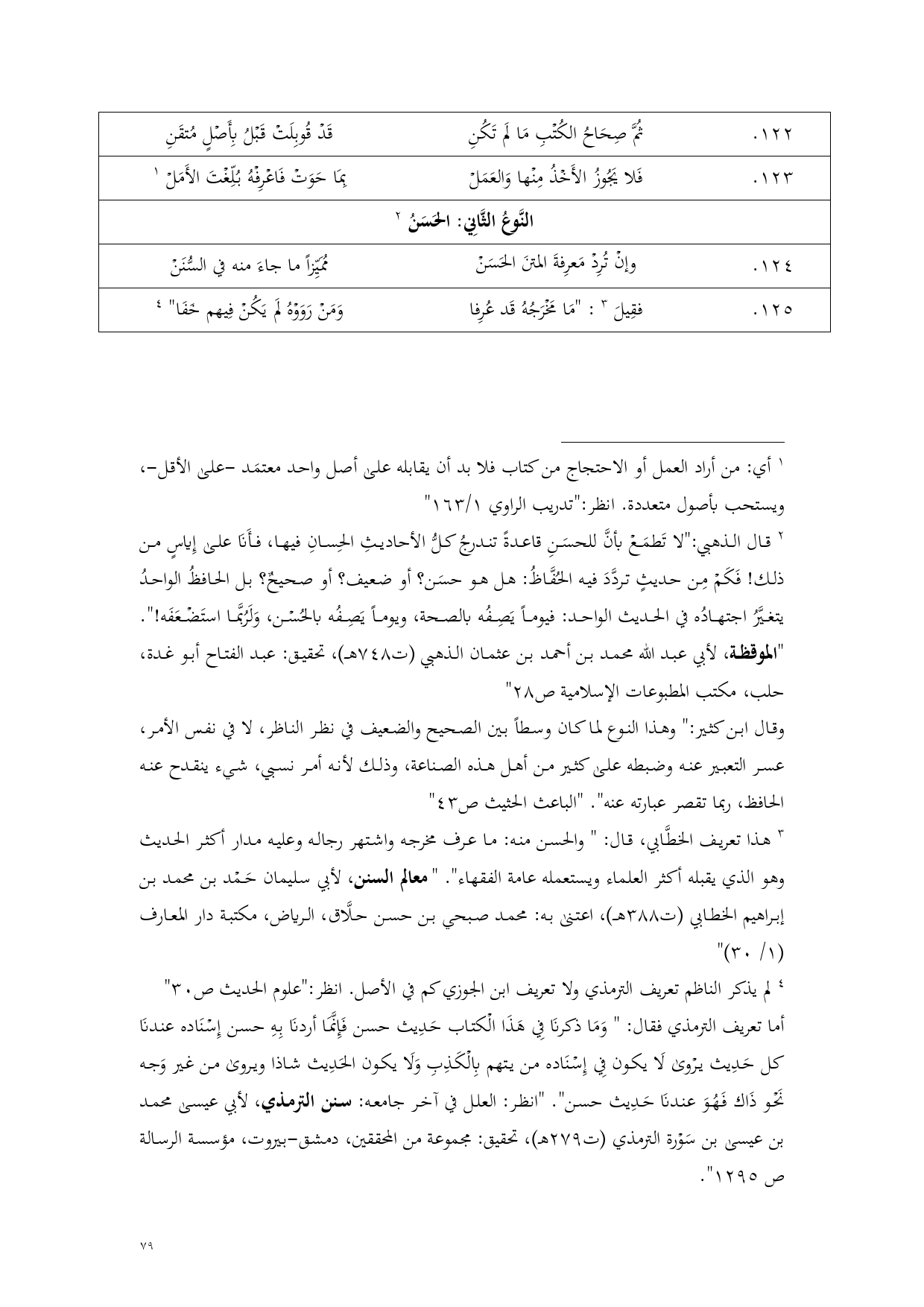 (¬2) قال الذهبي: "لا تَطمَعْ بأنَّ للحسَنِ قاعدةً تندرجُ كلُّ الأحاديثِ الحِسانِ فيها، فأَنَا على إِياسٍ من ذلك! فَكَمْ مِن حديثٍ تردَّدَ فيه الحُفَّاظُ: هل هو حسَن؟ أو ضعيف؟ أو صحيحٌ؟ بل الحافظُ الواحدُ يتغيَّرُ اجتهادُه في الحديث الواحد: فيوماً يَصِفُه بالصحة، ويوماً يَصِفُه بالحُسْن، وَلَرُبَّما استَضْعَفَه! ". "الموقظة، لأبي عبد الله محمد بن أحمد بن عثمان الذهبي (ت 748 هـ)، تحقيق: عبد الفتاح أبو غدة، حلب، مكتب المطبوعات الإسلامية ص 28"