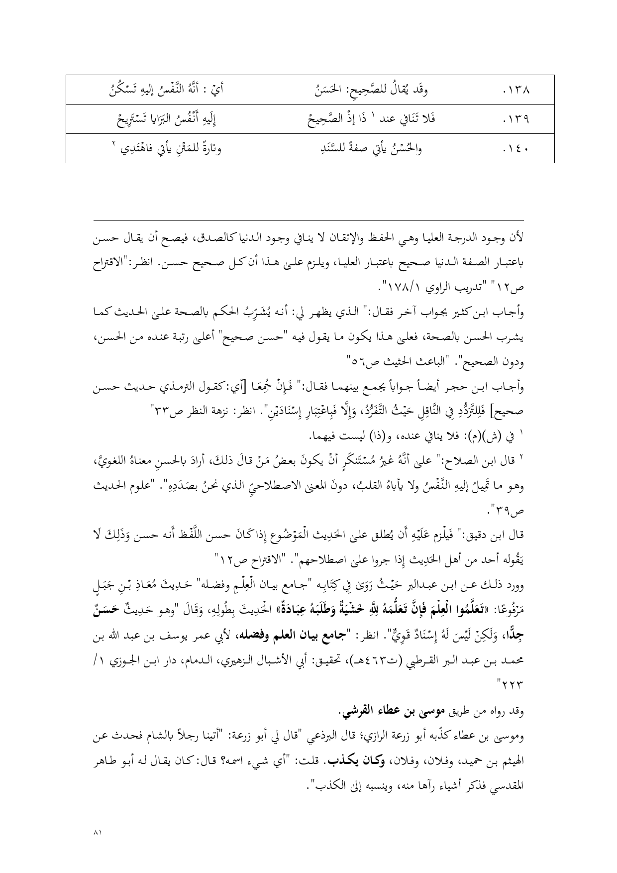 138 - وقَد يُقالُ للصَّحِيحِ: الحَسَنُ ... أيْ: أنَّهُ النَّفْسُ إليهِ تَسْكُنُ