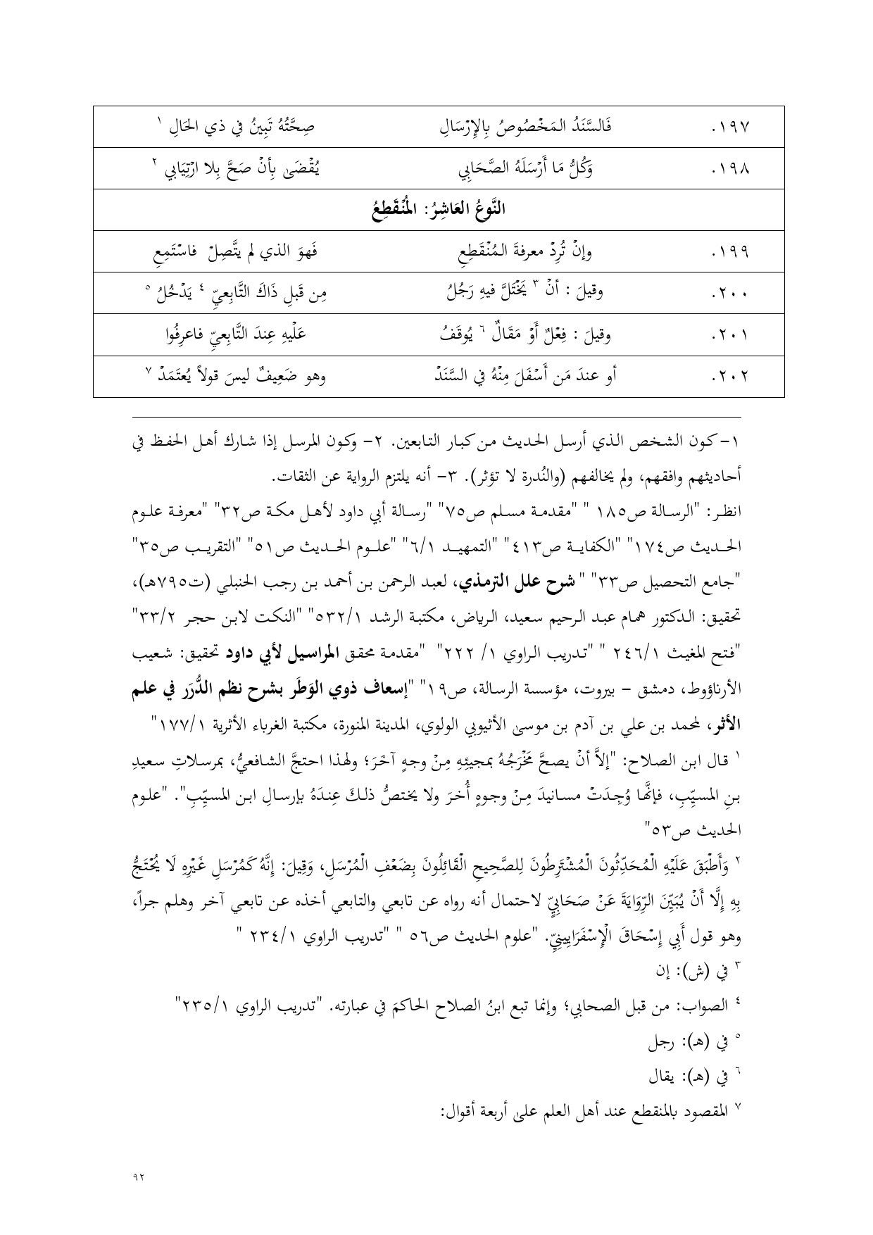 199 - وإنْ تُرِدْ معرفةَ المُنْقَطِعِ ... فَهوَ الذي لم يتَّصِلْ فاسْتَمِع