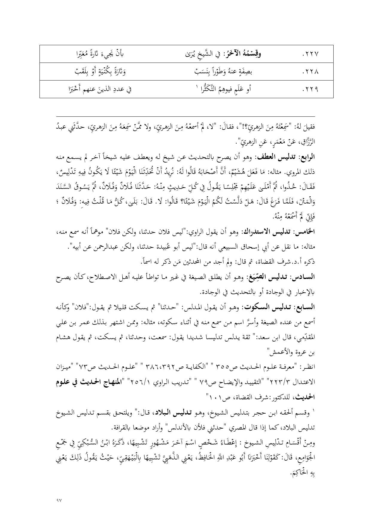 (¬1) وقسم ألحقه ابن حجر بتدليس الشيوخ، وهو تدليس البلاد، قال: " ويلتحق بقسم تدليس الشيوخ تدليس البلاد، كما إذا قال المصري "حدثني فلأن بالأندلس" وأراد موضعا بالقرافة.