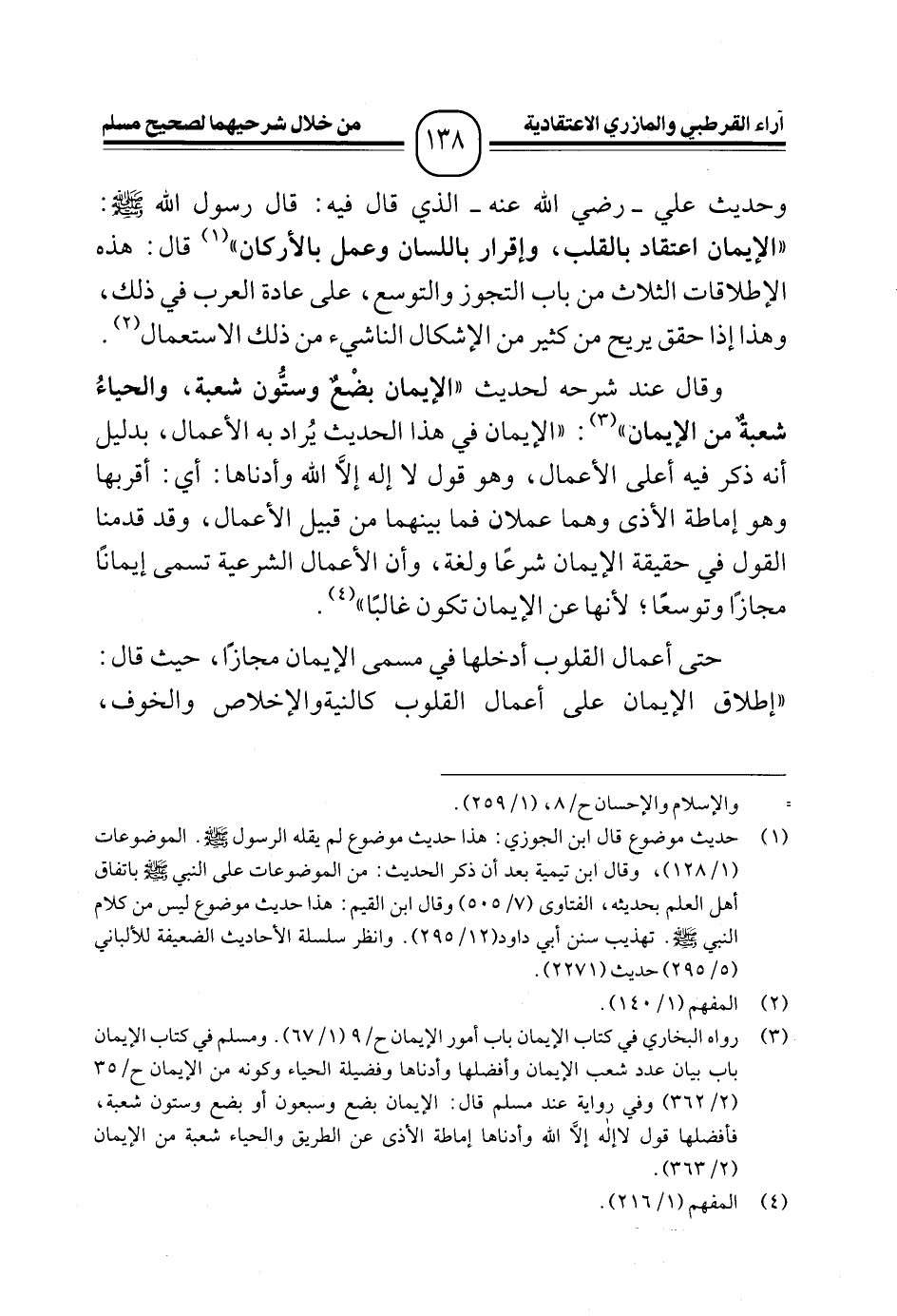 (¬٣) رواه البخاري في كتاب الإيمان باب أمور الإيمان ح/ ٩ (١/ ٦٧). ومسلم في كتاب الإيمان باب بيان عدد شعب الإيمان وأفضلها وأدناها وفضيلة الحياء وكونه من الإيمان ح/ ٣٥ (٢/ ٣٦٢) وفي رواية عند مسلم قال: الإيمان بضع وسبعون أو بضع وستون شعبة، فأفضلها قول لا إله إلَّا الله وأدناها إماطة الأذى عن الطريق والحياء شعبة من الإيمان (٢/ ٣٦٣).