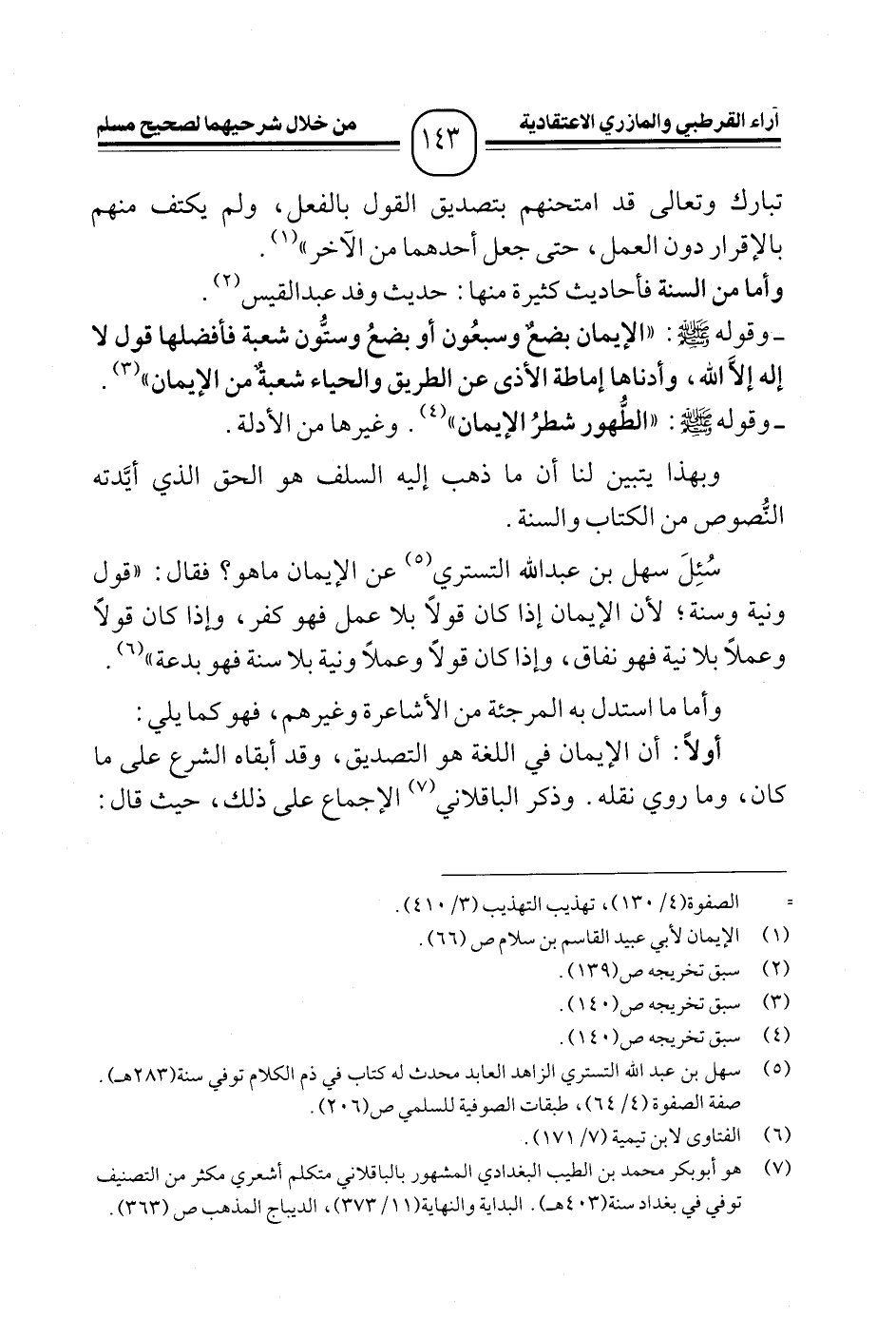 (¬٧) هو أبو بكر محمد بن الطيب البغدادي المشهور بالباقلاني متكلم أشعري مكثر من التصنيف توفي في بغداد سنة (٤٠٣ هـ). البداية والنهاية (١١/ ٣٧٣)، الديباج المذهب ص (٣٦٣).