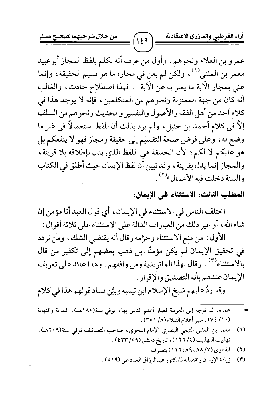 الأول: من منع الاستثناء وحرَّمه وقال أنه يقتضي الشك، ومن تردد في تحقيق الإيمان لم يكن مؤمنًا. بل ذهب بعضهم إلى تكفير من قال بالاستثناء (¬٣). وقال بهذا الماتريدية ومن وافقهم. وهذا عائد على تعريف الإيمان عندهم بأنه التصديق والإقرار.