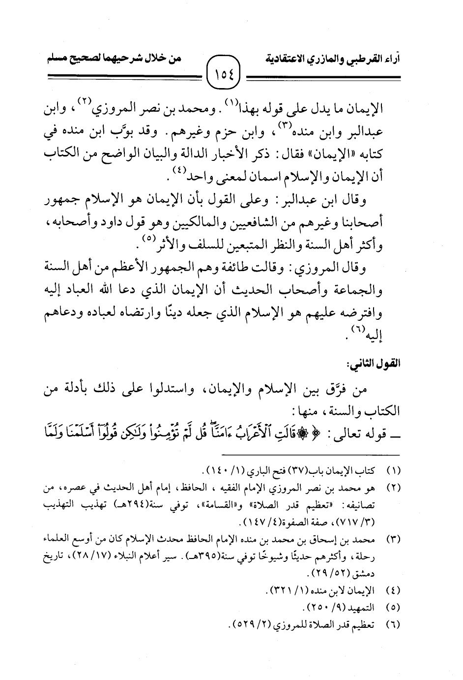 وقال ابن عبد البر: وعلى القول بأن الإيمان هو الإسلام جمهور أصحابنا وغيرهم من الشافعيين والمالكيين وهو قول داود وأصحابه، وأكثر أهل السنة والنظر المتبعين للسلف والأثر (¬٥).
