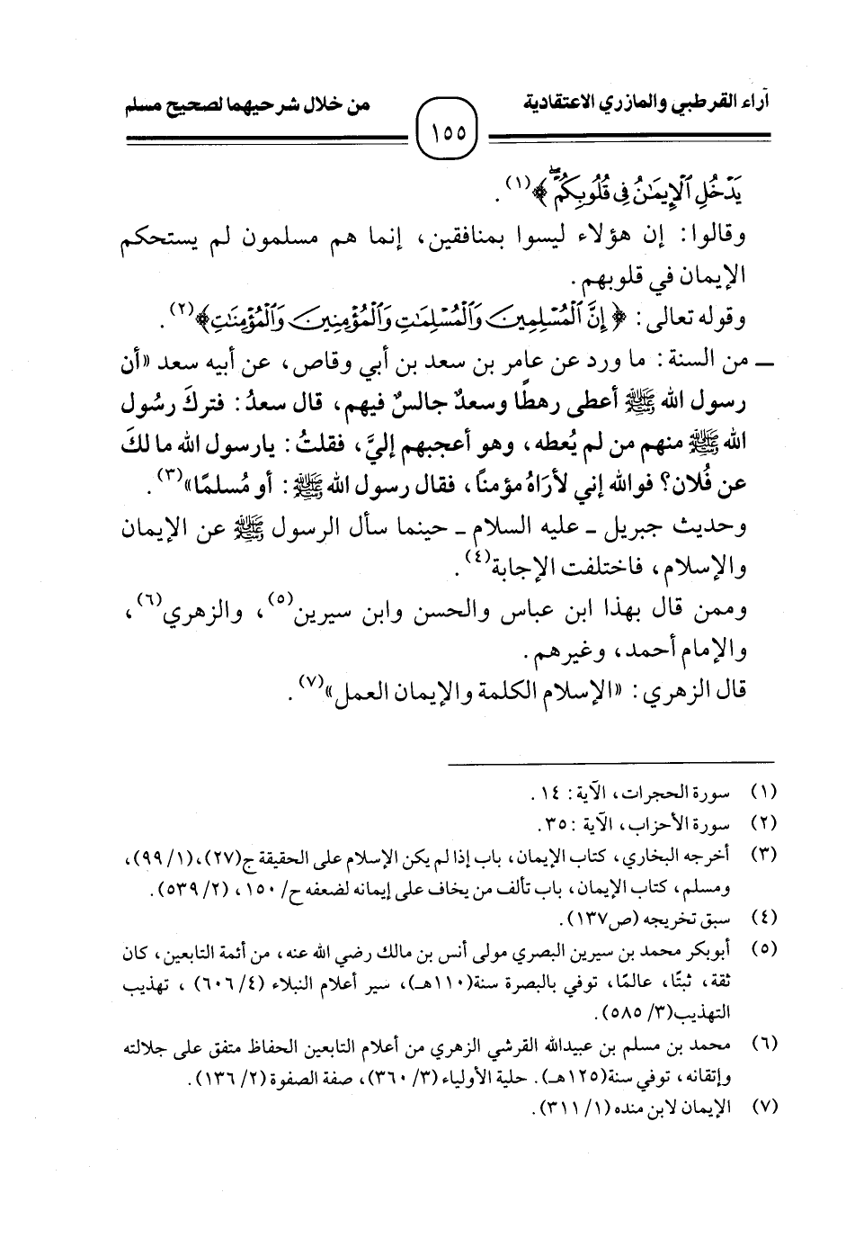 - من السنة: ما ورد عن عامر بن سعد بن أبي وقاص، عن أبيه سعد "أن رسول الله - صلى الله عليه وسلم - أعطى رهطًا وسعدٌ جالسٌ فيهم، قال سعدُ: فتركَ رسُول الله - صلى الله عليه وسلم - منهم من لم يُعطه، وهو أعجبهم إليَّ، فقلتُ: يارسول الله ما لكَ عن فُلان؟ فوالله إنى لأرَاهُ مؤمنًا، فقال رسول الله - صلى الله عليه وسلم -: أو مُسلمًا" (¬٣).