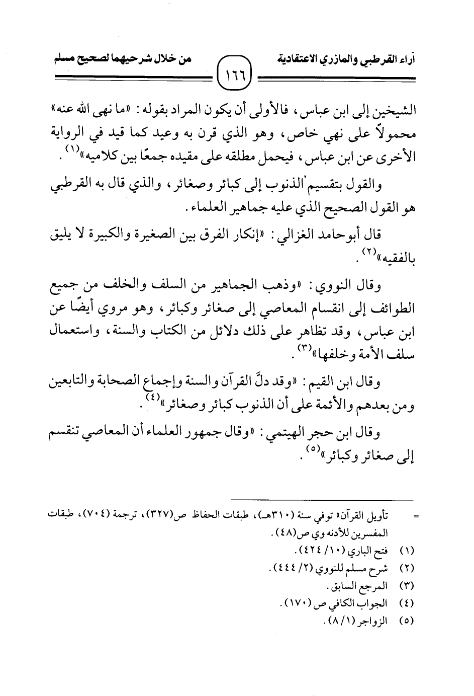 وقال النووي: "وذهب الجماهير من السلف والخلف من جميع الطوائف إلى انقسام المعاصي إلى صغائر وكبائر، وهو مروي أيضًا عن ابن عباس، وقد تظاهر على ذلك دلائل من الكتاب والسنة، واستعمال سلف الأمة وخلفها" (¬٣).