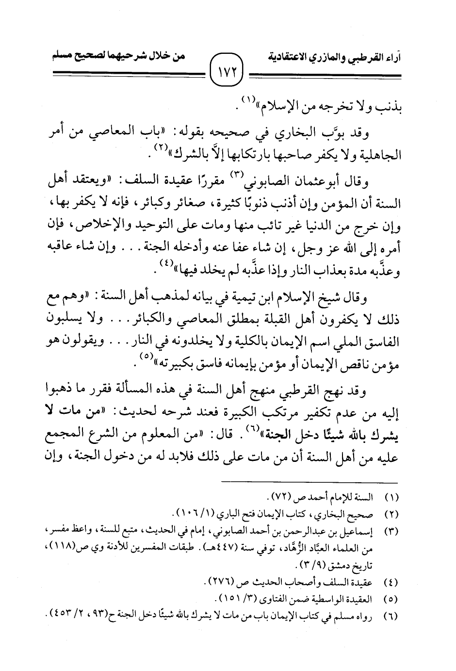 وقد نهج القرطبي منهج أهل السنة في هذه المسألة فقرر ما ذهبوا إليه من عدم تكفير مرتكب الكبيرة فعند شرحه لحديث: "من مات لا يشرك بالله شيئًا دخل الجنة" (¬٦). قال: "من المعلوم من الشرع المجمع عليه من أهل السنة أن من مات على ذلك فلابد له من دخول الجنة، وإن