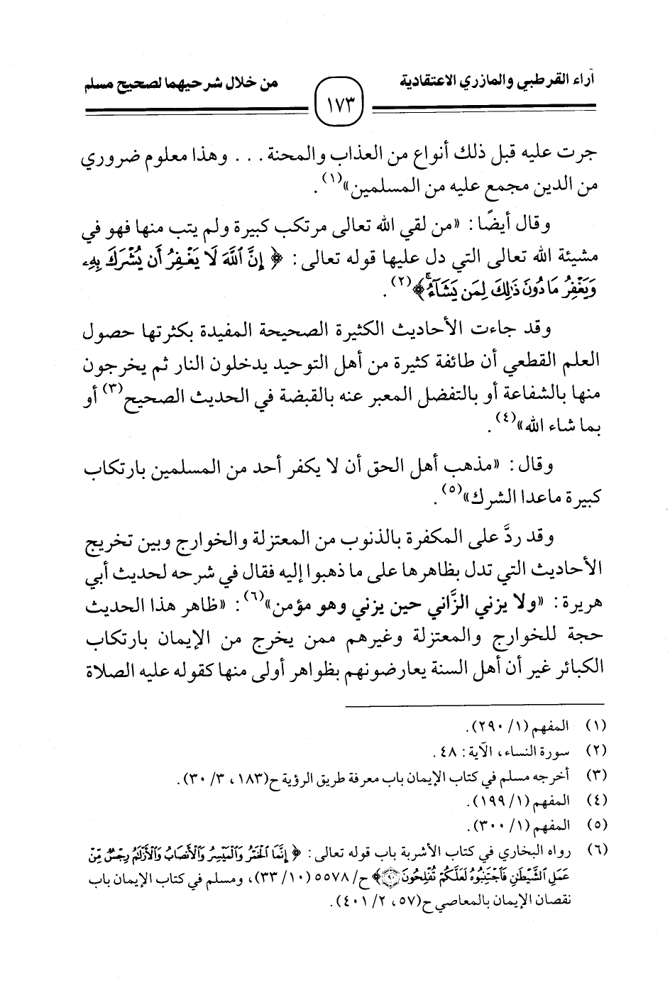 وقال أيضًا: "من لقي الله تعالى مرتكب كبيرة ولم يتب منها فهو في مشيئة الله تعالى التي دل عليها قوله تعالى: {إِنَّ اللَّهَ لَا يَغْفِرُ أَنْ يُشْرَكَ بِهِ وَيَغْفِرُ مَا دُونَ ذَلِكَ لِمَنْ يَشَاءُ} (¬٢).