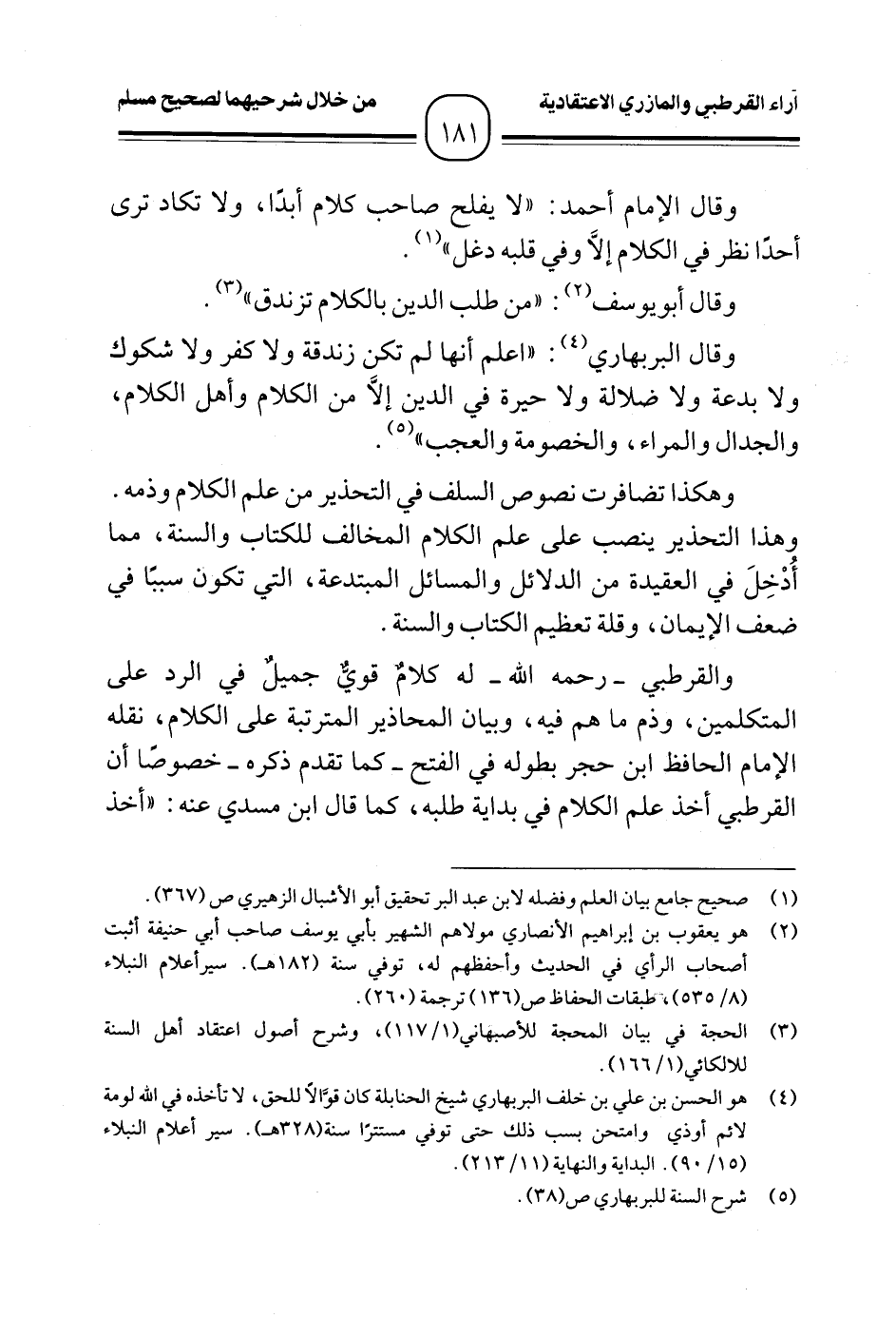 وقال البربهاري (¬٤): "اعلم أنها لم تكن زندقة ولا كفر ولا شكوك ولا بدعة ولا ضلالة ولا حيرة في الدين إلا من الكلام وأهل الكلام، والجدال والمراء، والخصومة والعجب" (¬٥).