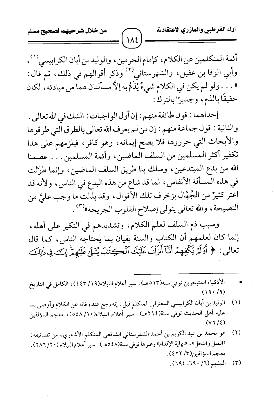 أئمة المتكلمين عن الكلام، كإمام الحرمين، والوليد بن أبان الكرابيسي (¬١)، وأبي الوفا بن عقيل، والشهرستاني (¬٢) وذكر أقوالهم في ذلك، ثم قال: " ... ولو لم يكن في الكلام شيءٌ يُذمُّ به إلَّا مسألتان هما من مبادئه، لكان حقيقًا بالذم، وجديرًا بالترك: