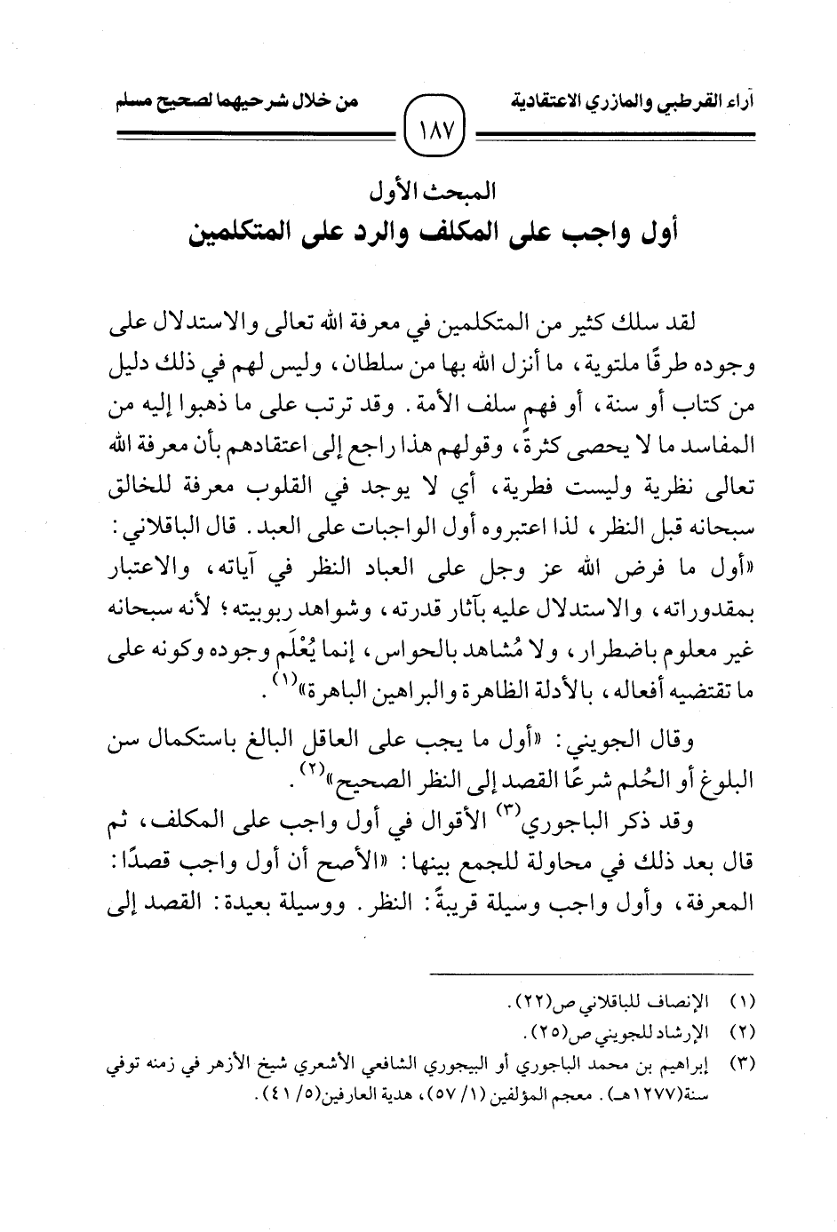 وقال الجويني: "أول ما يجب على العاقل البالغ باستكمال سن البلوغ أو الحُلم شرعًا القصد إلى النظر الصحيح" (¬٢).