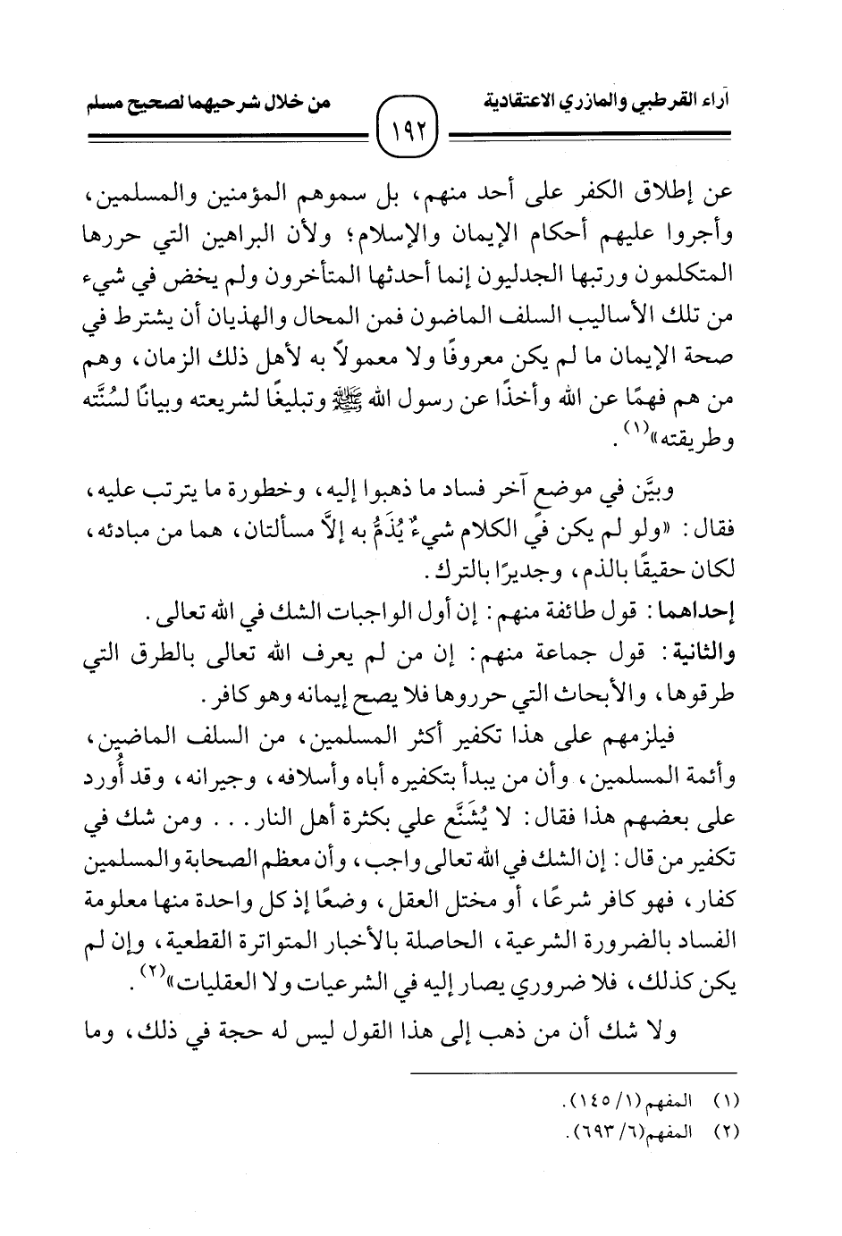 عن إطلاق الكفر على أحد منهم، بل سموهم المؤمنين والمسلمين، وأجروا عليهم أحكام الإيمان والإسلام؛ ولأن البراهين التي حررها المتكلمون ورتبها الجدليون إنما أحدثها المتأخرون ولم يخض في شيء من تلك الأساليب السلف الماضون فمن المحال والهذيان أن يشترط في صحة الإيمان ما لم يكن معروفًا ولا معمولًا به لأهل ذلك الزمان، وهم من هم فهمًا عن الله وأخذًا عن رسول الله - صلى الله عليه وسلم - وتبليغًا لشريعته وبيانًا لسُنَّته وطريقته" (¬١).