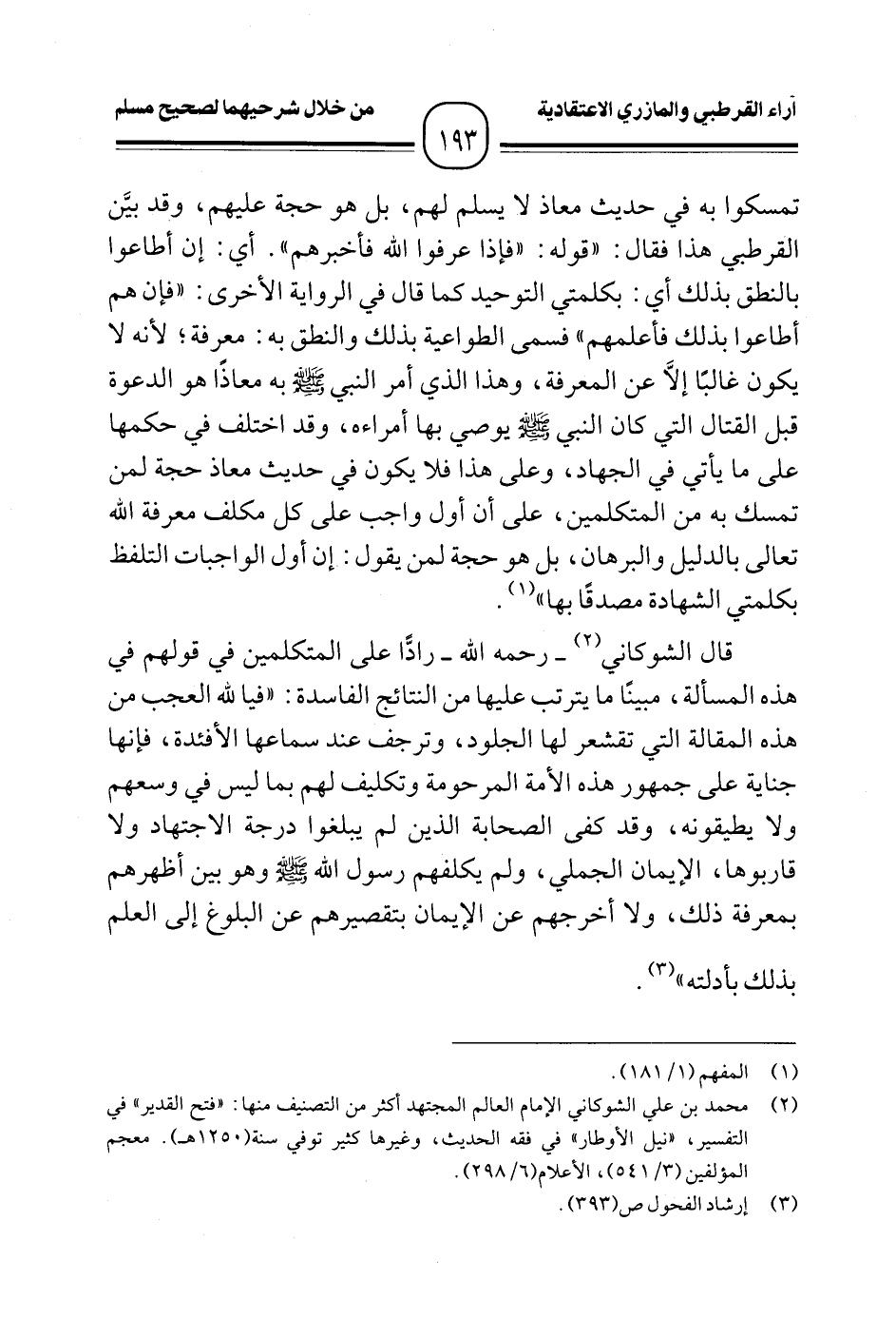 تمسكوا به في حديث معاذ لا يسلم لهم، بل هو حجة عليهم، وقد بيَّن القرطبي هذا فقال: "قوله: "فإذا عرفوا الله فأخبرهم". أي: إن أطاعوا بالنطق بذلك أي: بكلمتي التوحيد كما قال في الرواية الأخرى: "فإن هم أطاعوا بذلك فأعلمهم" فسمى الطواعية بذلك والنطق به: معرفة؛ لأنه لا يكون غالبًا إلَّا عن المعرفة، وهذا الذي أمر النبي - صلى الله عليه وسلم - به معاذًا هو الدعوة قبل القتال التي كان النبي - صلى الله عليه وسلم - يوصي بها أمراءه، وقد اختلف في حكمها على ما يأتي في الجهاد، وعلى هذا فلا يكون في حديث معاذ حجة لمن تمسك به من المتكلمين، على أن أول واجب على كل مكلف معرفة الله تعالى بالدليل والبرهان، بل هو حجة لمن يقول: إن أول الواجبات التلفظ بكلمتي الشهادة مصدقًا بها" (¬١).