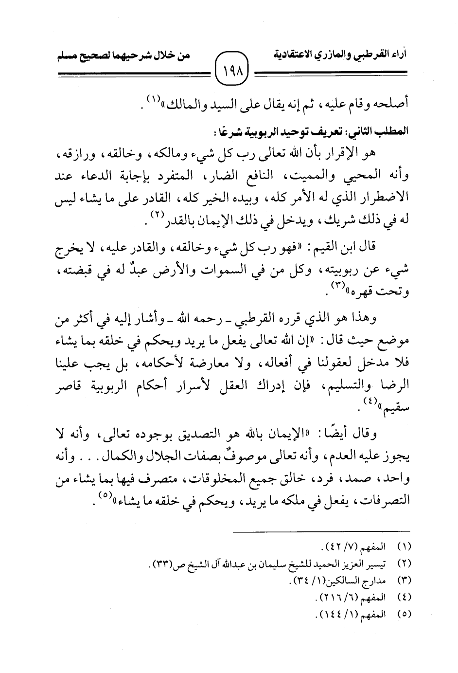 وهذا هو الذي قرره القرطبي -رحمه الله- وأشار إليه في أكثر من موضع حيث قال: "إن الله تعالى يفعل ما يريد ويحكم في خلقه بما يشاء فلا مدخل لعقولنا في أفعاله، ولا معارضة لأحكامه، بل يجب علينا الرضا والتسليم، فإن إدراك العقل لأسرار أحكام الربوبية قاصر سقيم" (¬٤).