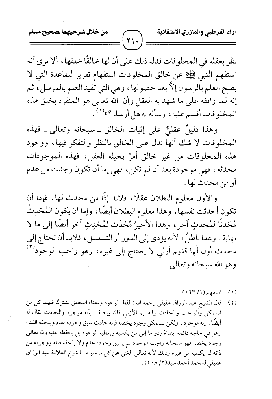 (¬٢) قال الشيخ عبد الرزاق عفيفي رحمه الله: لفظ الوجود ومعناه المطلق يشترك فيهما كل من الممكن والواجب والحادث والقديم الأزلي فالله يوصف بأنه موجود والحادث يقال له أيضًا: إنه موجود. ولكن للممكن وجود يخصه فإنه حادث سبق وجوده عدم ويلحقه الفناء وهو في حاجة دائمة ابتداءً ودوامًا إلى من يكسبه ويعطيه الوجود بل يحفظه عليه ولله تعالى وجود يخصه فهو سبحانه واجب الوجود لم يسبق وجوده عدم ولا يلحقه فناء ووجوده من ذاته لم يكسبه من غيره وذلك لأنه تعالى الغني عن كل ما سواه. الشيخ العلامة عبد الرزاق عفيفي لمحمد أحمد سيد (٢/ ٤٠٨).