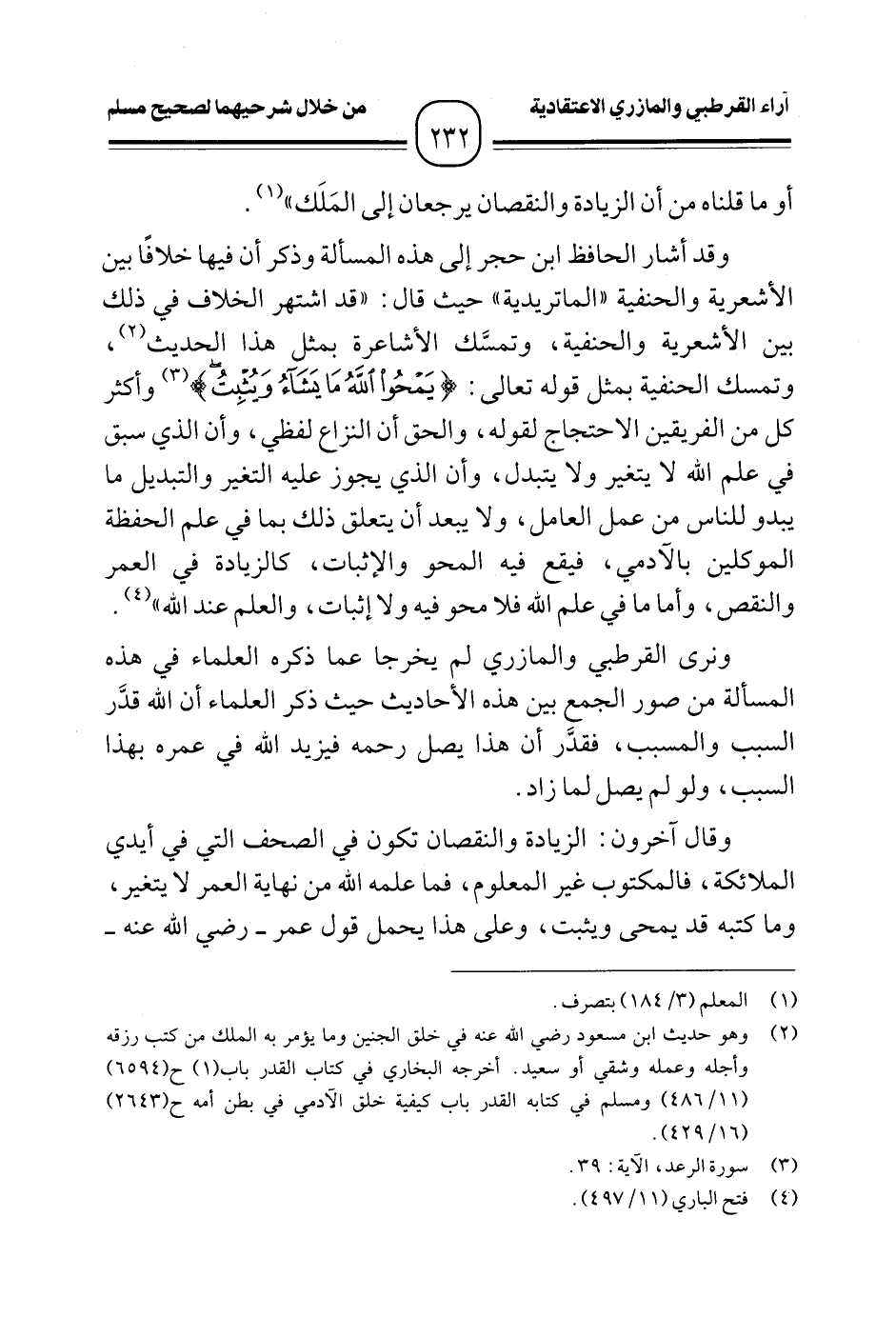 وقد أشار الحافظ ابن حجر إلى هذه المسألة وذكر أن فيها خلافًا بين الأشعرية والحنفية "الماتريدية" حيث قال: "قد اشتهر الخلاف في ذلك بين الأشعرية والحنفية، وتمسَّك الأشاعرة بمثل هذا الحديث (¬٢)، وتمسك الحنفية بمثل قوله تعالى: {يَمْحُو اللَّهُ مَا يَشَاءُ وَيُثْبِتُ} (¬٣) وأكثر كل من الفريقين الاحتجاج لقوله، والحق أن النزاع لفظي، وأن الذي سبق في علم الله لا يتغير ولا يتبدل، وأن الذي يجوز عليه التغير والتبديل ما يبدو للناس من عمل العامل، ولا يبعد أن يتعلق ذلك بما في علم الحفظة الموكلين بالآدمي، فيقع فيه المحو والإثبات، كالزيادة في العمر والنقص، وأما ما في علم الله فلا محو فيه ولا إثبات، والعلم عند الله" (¬٤).