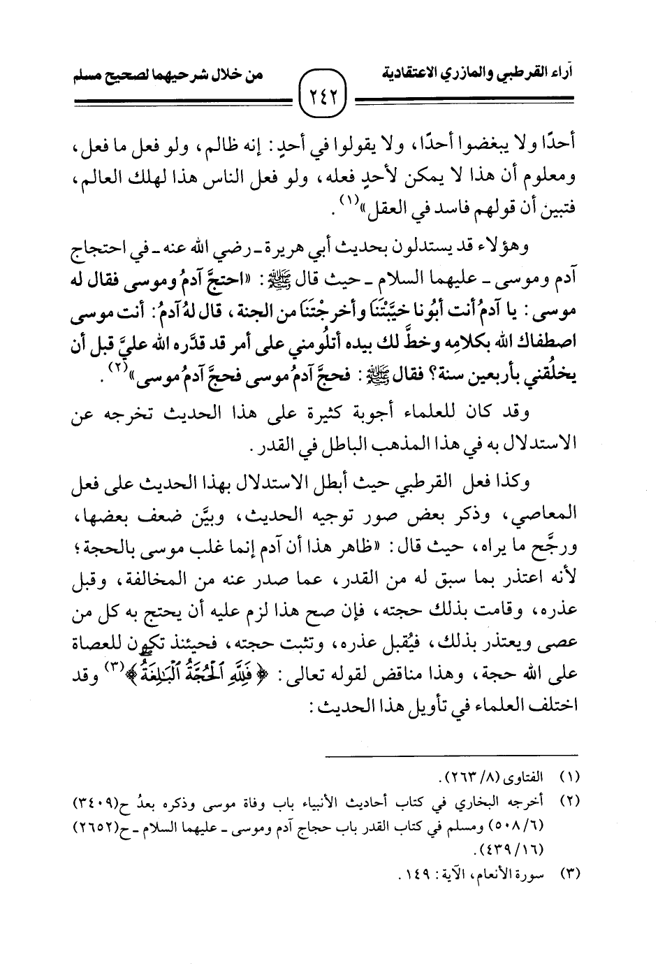 وكذا فعل القرطبي حيث أبطل الاستدلال بهذا الحديث على فعل المعاصي، وذكر بعض صور توجيه الحديث، وبيَّن ضعف بعضها، ورجَّح ما يراه، حيث قال: "ظاهر هذا أن آدم إنما غلب موسى بالحجة؛ لأنه اعتذر بما سبق له من القدر، عما صدر عنه من المخالفة، وقبل عذره، وقامت بذلك حجته، فإن صح هذا لزم عليه أن يحتج به كل من عصى ويعتذر بذلك، فيُقبل عذره، وتثبت حجته، فحينئذ تكون للعصاة على الله حجة، وهذا مناقض لقوله تعالى: {فَلِلَّهِ الْحُجَّةُ الْبَالِغَةُ} (¬٣) وقد اختلف العلماء في تأويل هذا الحديث: