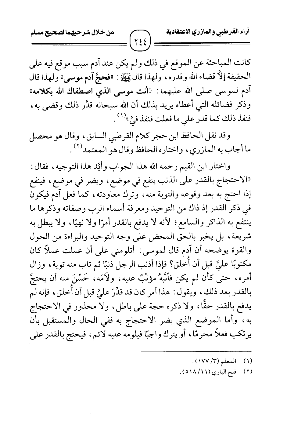 واختار ابن القيم رحمه الله هذا الجواب وأيَّد هذا التوجيه، فقال: "الاحتجاج بالقدر على الذنب ينفع في موضع، ويضر في موضع، فينفع إذا احتج به بعد وقوعه والتوبة منه، وترك معاودته، كما فعل آدم فيكون في ذكر القدر إذ ذاك من التوحيد ومعرفة أسماء الرب وصفاته وذكرها ما ينتفع به الذاكر والسامع؛ لأنه لا يدفع بالقدر أمرًا ولا نهيًا، ولا يبطل به شريعة، بل يخبر بالحق المحض على وجه التوحيد والبراءة من الحول والقوة يوضحه أن آدم قال لموسى: أتلومني على أن عملت عملًا كان مكتوبًا عليَّ قبل أن أُخلق؟ فإذا أذنب الرجل ذنبًا ثم تاب منه توبة، وزال أمره، حتى كأن لم يكن فأنَّبهُ مؤنِّبٌ عليه، ولَامَه، حَسُنَ منه أن يحتجَّ بالقدر بعد ذلك، ويقول: هذا أمر كان قد قدِّرَ عليَّ قبل أن أُخلق، فإنه لم يدفع بالقدر حقًّا، ولا ذكره حجة على باطل، ولا محذور في الاحتجاج به، وأما الموضع الذي يضر الاحتجاج به ففي الحال والمستقبل بأن يرتكب فعلًا محرمًا، أو يترك واجبًا فيلومه عليه لائم، فيحتج بالقدر على