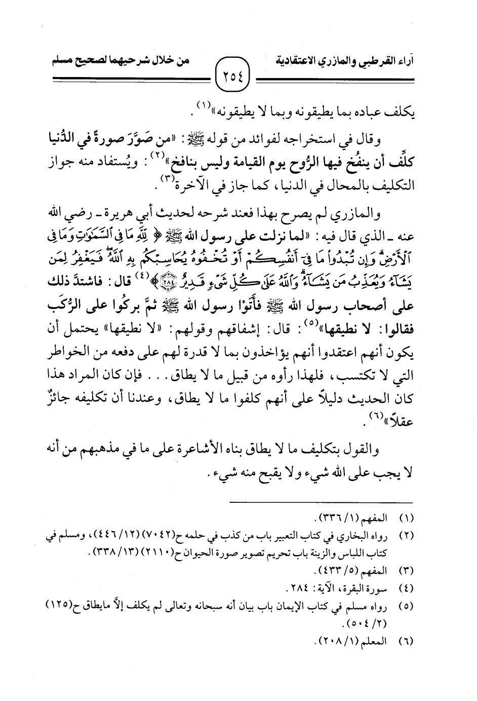 والمازري لم يصرح بهذا فعند شرحه لحديث أبي هريرة- رضي الله عنه- الذي قال فيه: "لما نزلت على رسول الله -صلى الله عليه وسلم- {لِلَّهِ مَا فِي السَّمَاوَاتِ وَمَا فِي الْأَرْضِ وَإِنْ تُبْدُوا مَا فِي أَنْفُسِكُمْ أَوْ تُخْفُوهُ يُحَاسِبْكُمْ بِهِ اللَّهُ فَيَغْفِرُ لِمَنْ يَشَاءُ وَيُعَذِّبُ مَنْ يَشَاءُ وَاللَّهُ عَلَى كُلِّ شَيْءٍ قَدِيرٌ (٢٨٤)} (¬٤) قال: فاشتدَّ ذلك على أصحاب رسول الله -صلى الله عليه وسلم- فأَتوْا رسول الله -صلى الله عليه وسلم- ثمَّ بركُوا على الرُّكَب فقالوا: لا نطيقها" (¬٥): قال: إشفاقهم وقولهم: "لا نطيقها" يحتمل أن يكون أنهم اعتقدوا أنهم يؤاخذون بما لا قدرة لهم على دفعه من الخواطر التي لا تكتسب، فلهذا رأوه من قبيل ما لا يطاق ... فإن كان المراد هذا كان الحديث دليلًا على أنهم كلفوا ما لا يطاق، وعندنا أن تكليفه جائزٌ عقلًا" (¬٦).