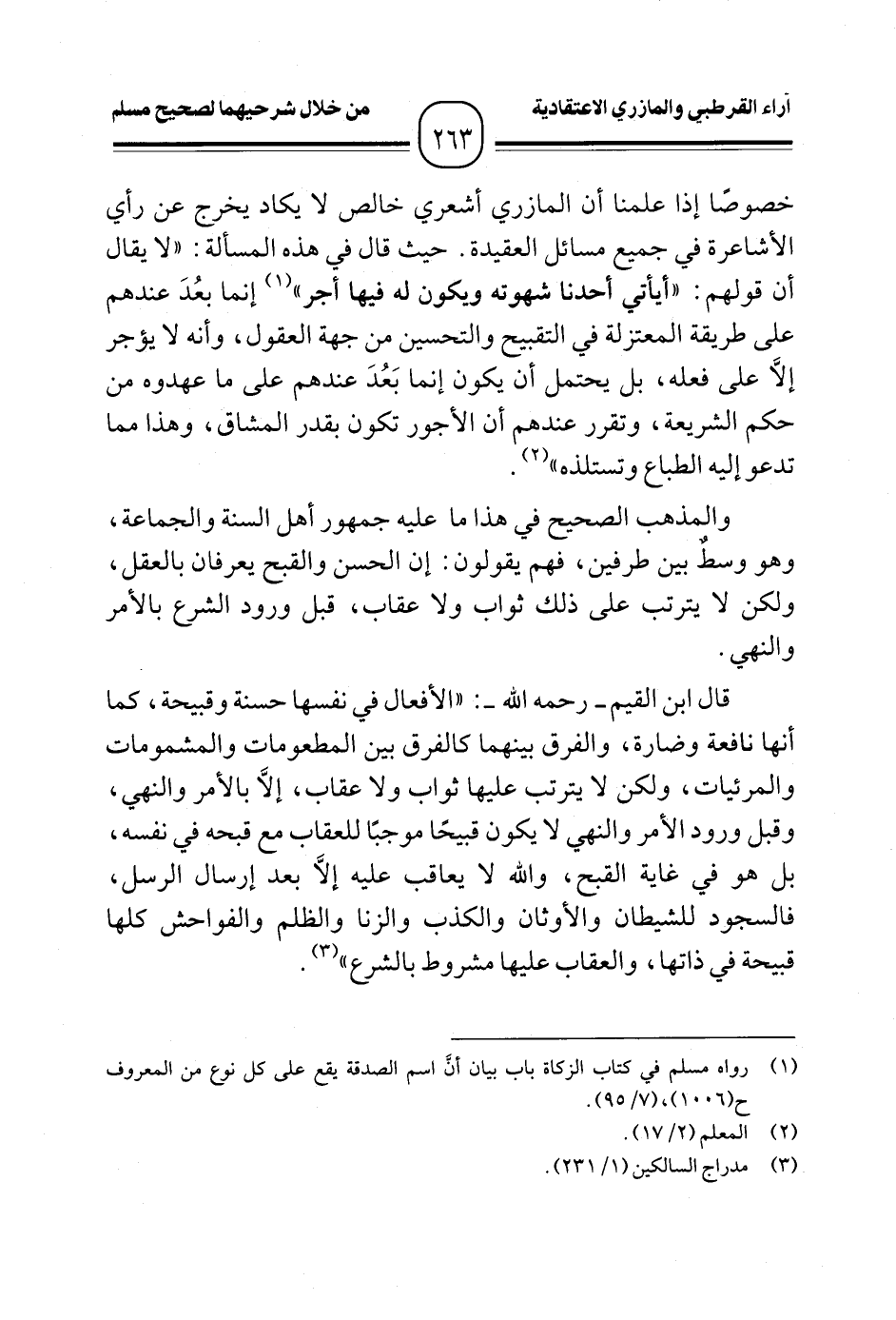 خصوصًا إذا علمنا أن المازري أشعري خالص لا يكاد يخرج عن رأي الأشاعرة في جميع مسائل العقيدة. حيث قال في هذه المسألة: "لا يقال أن قولهم: "أيأتي أحدنا شهوته ويكون له فيها أجر" (¬١) إنما بعُدَ عندهم على طريقة المعتزلة في التقبيح والتحسين من جهة العقول، وأنه لا يؤجر إلَّا على فعله، بل يحتمل أن يكون إنما بَعُدَ عندهم على ما عهدوه من حكم الشريعة، وتقرر عندهم أن الأجور تكون بقدر المشاق، وهذا مما تدعو إليه الطباع وتستلذه" (¬٢).