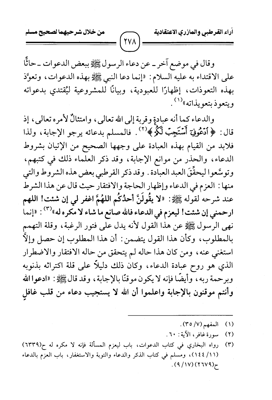 والدعاء كما أنه عباد وقربة إلى الله تعالى، وامتثالٌ لأمره تعالى، إذ قال: {ادْعُونِي أَسْتَجِبْ لَكُمْ} (¬٢). فالمسلم بدعائه يرجو الإجابة، ولذا فلابد من القيام بهذه العبادة على وجهها الصحيح من الإتيان بشروط الدعاء، والحذر من موانع الإجابة، وقد ذكر العلماء ذلك في كتبهم، وتوسَّعوا ليحقِّقَ العبد العبادة. وقد ذكر القرطبي بعض هذه الشروط والتي منها: العزم في الدعاء وإظهار الحاجة والافتقار حيث قال عن هذا الشرط عند شرحه لقوله -صلى الله عليه وسلم-: "لا يقُولَنَّ أحدُكُم اللهُمَّ اغفر لي إن شئت! اللهم ارحمني إن شئت! ليعزم في الدعاء فالله صانع ما شاء لا مكره له" (¬٣): "إنما نهى الرسول -صلى الله عليه وسلم- عن هذا القول لأنه يدل على فتور الرغبة، وقلة التهمم بالمطلوب، وكأن هذا القول يتضمن: أن هذا المطلوب إن حصل وإلَّا استغني عنه، ومن كان هذا حاله لم يتحقق من حاله الافتقار والاضطرار الذي هو روح عبادة الدعاء، وكان ذلك دليلًا على قلة اكتراثه بذنوبه وبرحمة ربه، وأيضًا فإنه لا يكون موقنًا بالإجابة، وقد قال -صلى الله عليه وسلم-: "ادعوا الله وأنتم موقنون بالإجابة واعلموا أن الله لا يستجيب دعاء من قلب غافلٍ