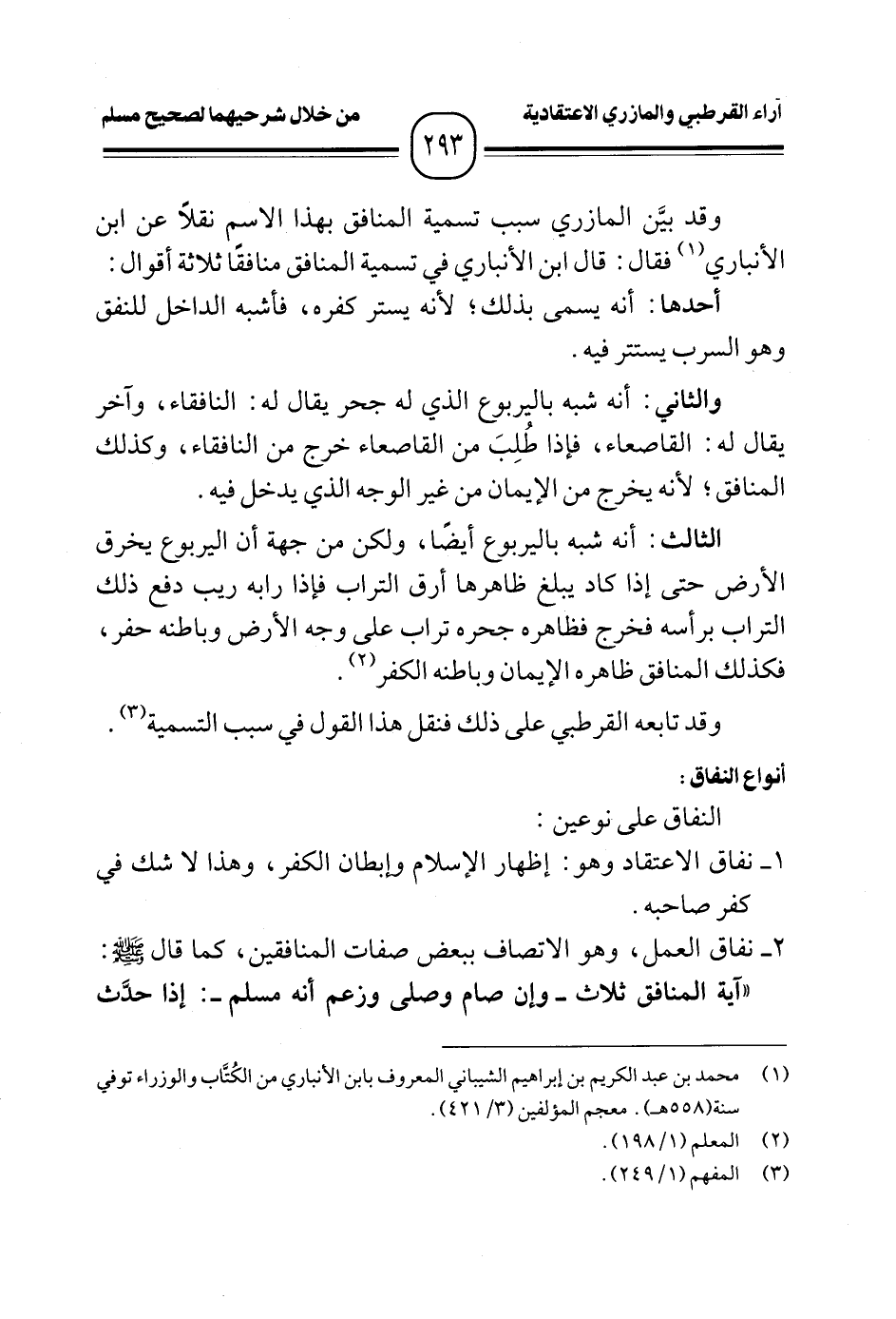 وقد بيَّن المازري سبب تسمية المنافق بهذا الاسم نقلًا عن ابن الأنباري (¬١) فقال: قال ابن الأنباري في تسمية المنافق منافقًا ثلاثة أقوال: