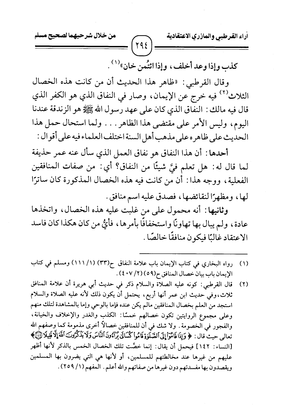 (¬٢) قال القرطبي: كونه عليه الصلاة والسلام ذكر في حديث أبي هريرة أن علامة المنافق ثلاث، وفي حديث ابن عمر أنها أربع، يحتمل أن يكون ذلك لأنه عليه الصلاة والسلام استجد من العلم بخصال المنافقين مالم يكن عنده فإما بالوحي وإما بالمشاهدة لتلك منهم وعلى مجموع الروايتين تكون خصالهم خمسًا: الكذب والغدر والإخلات والخيانة، والفجور في الخصومة. ولا شك في أن للمنافقين خصالًا أخرى مذمومة كما وصفهم الله تعالى حيث قال: {وَإِذَا قَامُوا إِلَى الصَّلَاةِ قَامُوا كُسَالَى يُرَاءُونَ النَّاسَ وَلَا يَذْكُرُونَ اللَّهَ إِلَّا قَلِيلًا (١٤٢)} [النساء: ١٤٢] فيحمل أن يقال: إنما خصَّت تلك الخصال الخمس بالذكر لأنها أظهر عليهم من غيرها عند مخالطتهم للمسلمين، أو لأنها هي التي يضرون بها المسلمين ويقصدون بها مفسدتهم دون غيرها من صفاتهم والله أعلم. المفهم (١/ ٢٥٩).