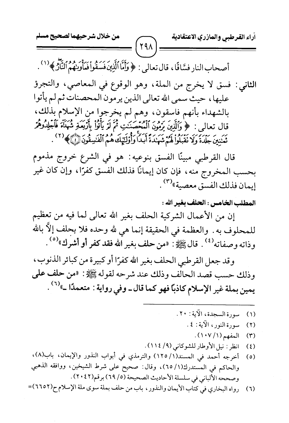 الثاني: فسق لا يخرج من الملة، وهو الوقوع في المعاصي، والتجرؤ عليها، حيث سمى الله تعالى الذين يرمون المحصنات ثم لم يأتوا بالشهداء بأنهم فاسقون، وهم لم يخرجوا من الإسلام بذلك، قال تعالى: {وَالَّذِينَ يَرْمُونَ الْمُحْصَنَاتِ ثُمَّ لَمْ يَأْتُوا بِأَرْبَعَةِ شُهَدَاءَ فَاجْلِدُوهُمْ ثَمَانِينَ جَلْدَةً وَلَا تَقْبَلُوا لَهُمْ شَهَادَةً أَبَدًا وَأُولَئِكَ هُمُ الْفَاسِقُونَ (٤)} (¬٢).