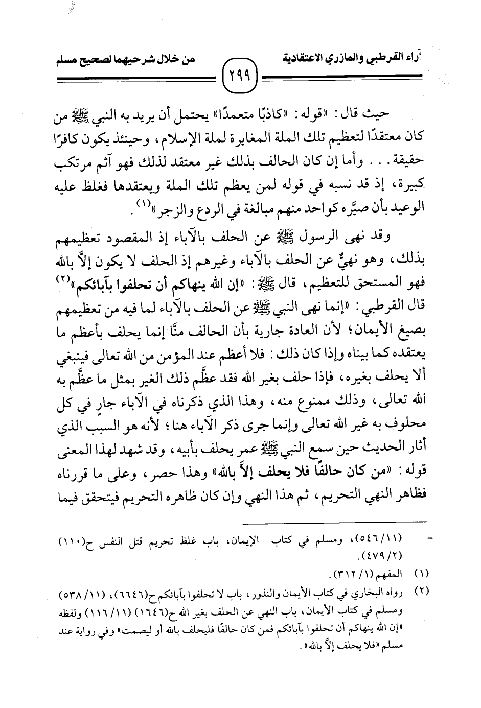 حيث قال: "قوله: "كاذبًا متعمدًا" يحتمل أن يريد به النبي -صلى الله عليه وسلم- من كان معتقدًا لتعظيم تلك الملة المغايرة لملة الإسلام، وحينئذ يكون كافرًا حقيقة ... وأما إن كان الحالف بذلك غير معتقد لذلك فهو آثم مرتكب كبيرة، إذ قد نسبه في قوله لمن يعظم تلك الملة ويعتقدها فغلظ عليه الوعيد بأن صيَّره كواحد منهم مبالغة في الردع والزجر" (¬١).