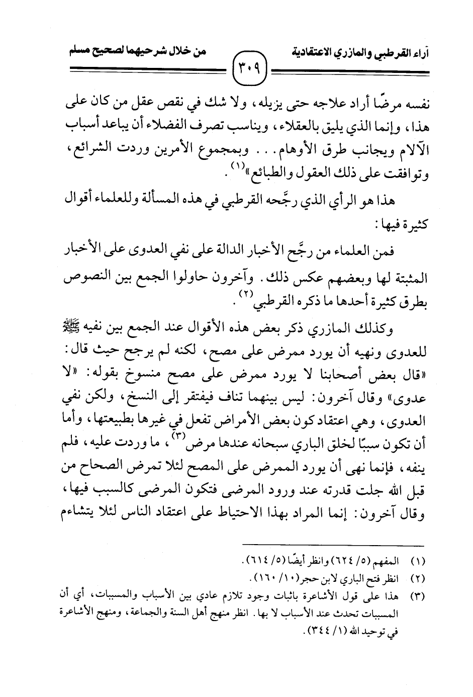 (¬٣) هذا على قول الأشاعرة بإثبات وجود تلازم عادي بين الأسباب والمسببات، أي أن المسببات تحدث عند الأسباب لا بها. انظر منهج أهل السنة والجماعة، ومنهج الأشاعرة في توحيد الله (١/ ٣٤٤).