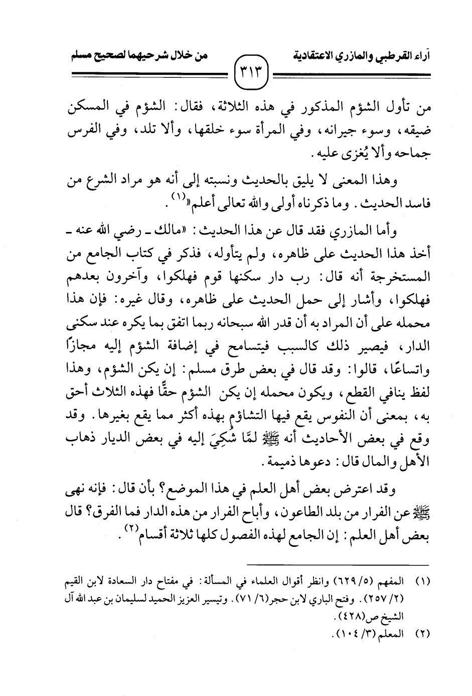 وأما المازري فقد قال عن هذا الحديث: "مالك -رضي الله عنه- أخذ هذا الحديث على ظاهره، ولم يتأوله، فذكر في كتاب الجامع من المستخرجة أنه قال: رب دار سكنها قوم فهلكوا، وآخرون بعدهم فهلكوا، وأشار إلى حمل الحديث على ظاهره، وقال غيره: فإن هذا محمله على أن المراد به أن قدر الله سبحانه ربما اتفق بما يكره عند سكنى الدار، فيصير ذلك كالسبب فيتسامح في إضافة الشؤم إليه مجازًا واتساعًا، قالوا: وقد قال في بعض طرق مسلم: إن يكن الشؤم، وهذا لفظ ينافي القطع، ويكون محمله إن يكن الشؤم حقًّا فهذه الثلاث أحق به، بمعنى أن النفوس يقع فيها التشاؤم بهذه أكثر مما يقع بغيرها. وقد وقع في بعض الأحاديث أنه -صلى الله عليه وسلم- لمَّا شكِيَ إليه في بعض الديار ذهاب الأهل والمال قال: دعوها ذميمة.