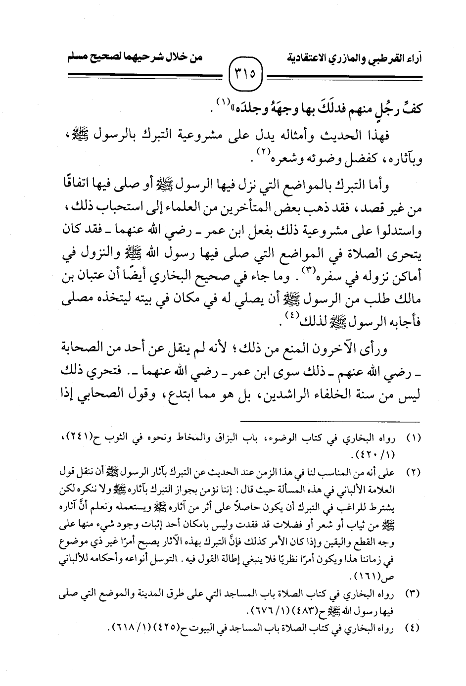 (¬٢) على أنه من المناسب لنا في هذا الزمن عند الحديث عن التبرك بآثار الرسول -صلى الله عليه وسلم- أن ننقل قول العلامة الألباني في هذه المسألة حيث قال: إننا نؤمن بجواز التبرك بآثاره-صلى الله عليه وسلم- ولا ننكره لكن يشترط للراغب في التبرك أن يكون حاصلًا على أثر من آثاره -صلى الله عليه وسلم- ويستعمله ونعلم أنَّ آثاره -صلى الله عليه وسلم- من ثياب أو شعر أو فضلات قد فقدت وليس بامكان أحد إثبات وجود شيء منها على وجه القطع واليقين وإذا كان الأمر كذلك فإن التبرك بهذه الآثار يصبح أمرًا غير ذي موضوع في زماننا هذا ويكون أمرًا نظريًا فلا ينبغي إطالة القول فيه. التوسل أنواعه وأحكامه للألباني ص (١٦١).