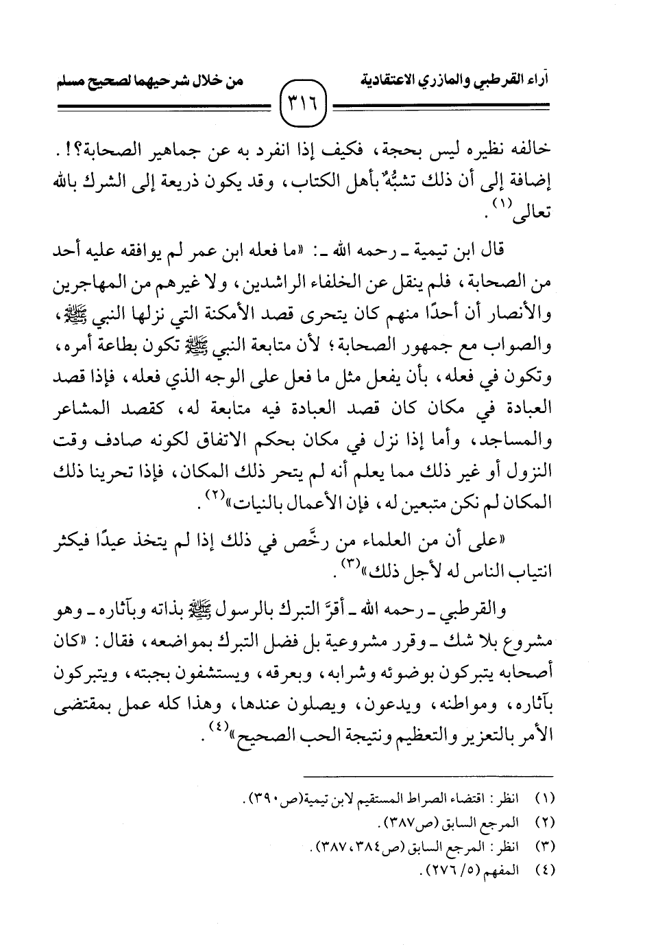 والقرطبي -رحمه الله- أقرَّ التبرك بالرسول -صلى الله عليه وسلم- بذاته وبآثاره -وهو مشروع بلا شك- وقرر مشروعية بل فضل التبرك بمواضعه، فقال: "كان أصحابه يتبركون بوضوئه وشرابه، وبعرقه، ويستشفون بجبته، ويتبركون بآثاره، ومواطنه، ويدعون، ويصلون عندها، وهذا كله عمل بمقتضى الأمر بالتعزير والتعظيم ونتيجة الحب الصحيح" (¬٤).
