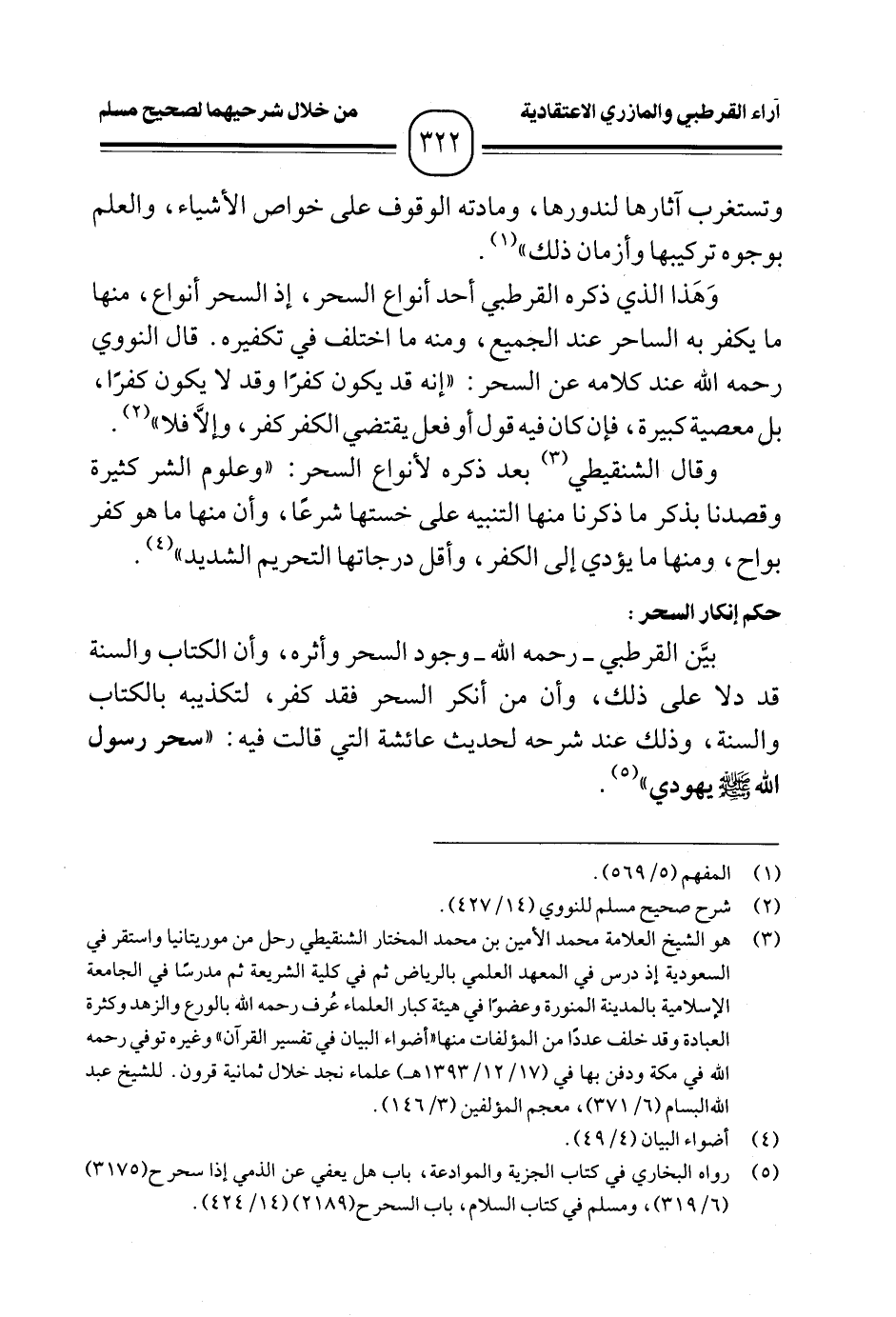 وقال الشنقيطي (¬٣) بعد ذكره لأنواع السحر: "وعلوم الشر كثيرة وقصدنا بذكر ما ذكرنا منها التنبيه على خستها شرعًا، وأن منها ما هو كفر بواح، ومنها ما يؤدي إلى الكفر، وأقل درجاتها التحريم الشديد" (¬٤).