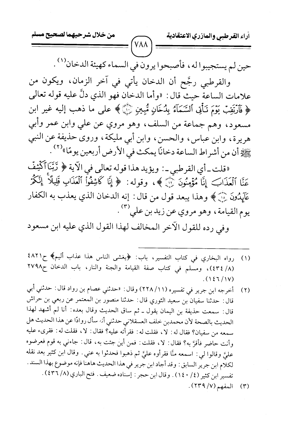 "قلت -أي القرطبي-: ويؤيد هذا قوله تعالى في الآية {رَبَّنَا اكْشِفْ عَنَّا الْعَذَابَ إِنَّا مُؤْمِنُونَ (١٢)}، وقوله: {إِنَّا كَاشِفُو الْعَذَابِ قَلِيلًا إِنَّكُمْ عَائِدُونَ (١٥)} وهذا يبعد قول من قال: إنه الدخان الذي يعذب به الكفار يوم القيامة، وهو مروي عن زيد بن علي (¬٣).
