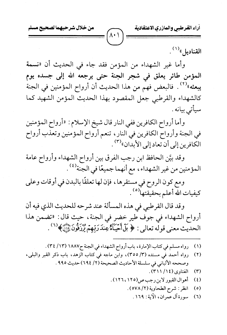 وقد قال القرطبي في هذه المسألة عند شرحه للحديث الذي فيه أن أرواح الشهداء في جوف طير خضر في الجنة، حيث قال: "تضمن هذا الحديث معنى قوله تعالى: {بَلْ أَحْيَاءٌ عِنْدَ رَبِّهِمْ يُرْزَقُونَ (١٦٩)} (¬٦).