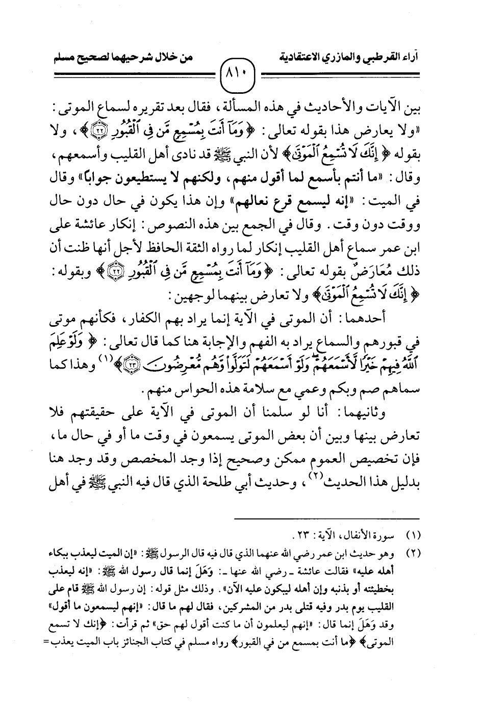 بين الآيات والأحاديث في هذه المسألة، فقال بعد تقريره لسماع الموتى: "ولا يعارض هذا بقوله تعالى: {وَمَا أَنْتَ بِمُسْمِعٍ مَنْ فِي الْقُبُورِ (٢٢)}، ولا بقوله {إِنَّكَ لَا تُسْمِعُ الْمَوْتَى} لأن النبي - صلى الله عليه وسلم - قد نادى أهل القليب وأسمعهم، وقال: "ما أنتم بأسمع لما أقول منهم، ولكنهم لا يستطيعون جوابًا" وقال في الميت: "إنه ليسمع قرع نعالهم" وإن هذا يكون في حال دون حال ووقت دون وقت. وقال في الجمع بين هذه النصوص: إنكار عائشة على ابن عمر سماع أهل القليب إنكار لما رواه الثقة الحافظ لأجل أنها ظنت أن ذلك مُعَارَضٌ بقوله تعالى: {وَمَا أَنْتَ بِمُسْمِعٍ مَنْ فِي الْقُبُورِ (٢٢)} وبقوله: {إِنَّكَ لَا تُسْمِعُ الْمَوْتَى} ولا تعارض بينهما لوجهين: