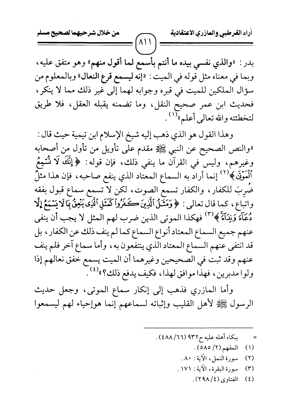 وأما المازري فذهب إلى إنكار سماع الموتى، وجعل حديث الرسول - صلى الله عليه وسلم - لأهل القليب وإثباته لسماعهم إنما هو إحياء لهم ليسمعوا