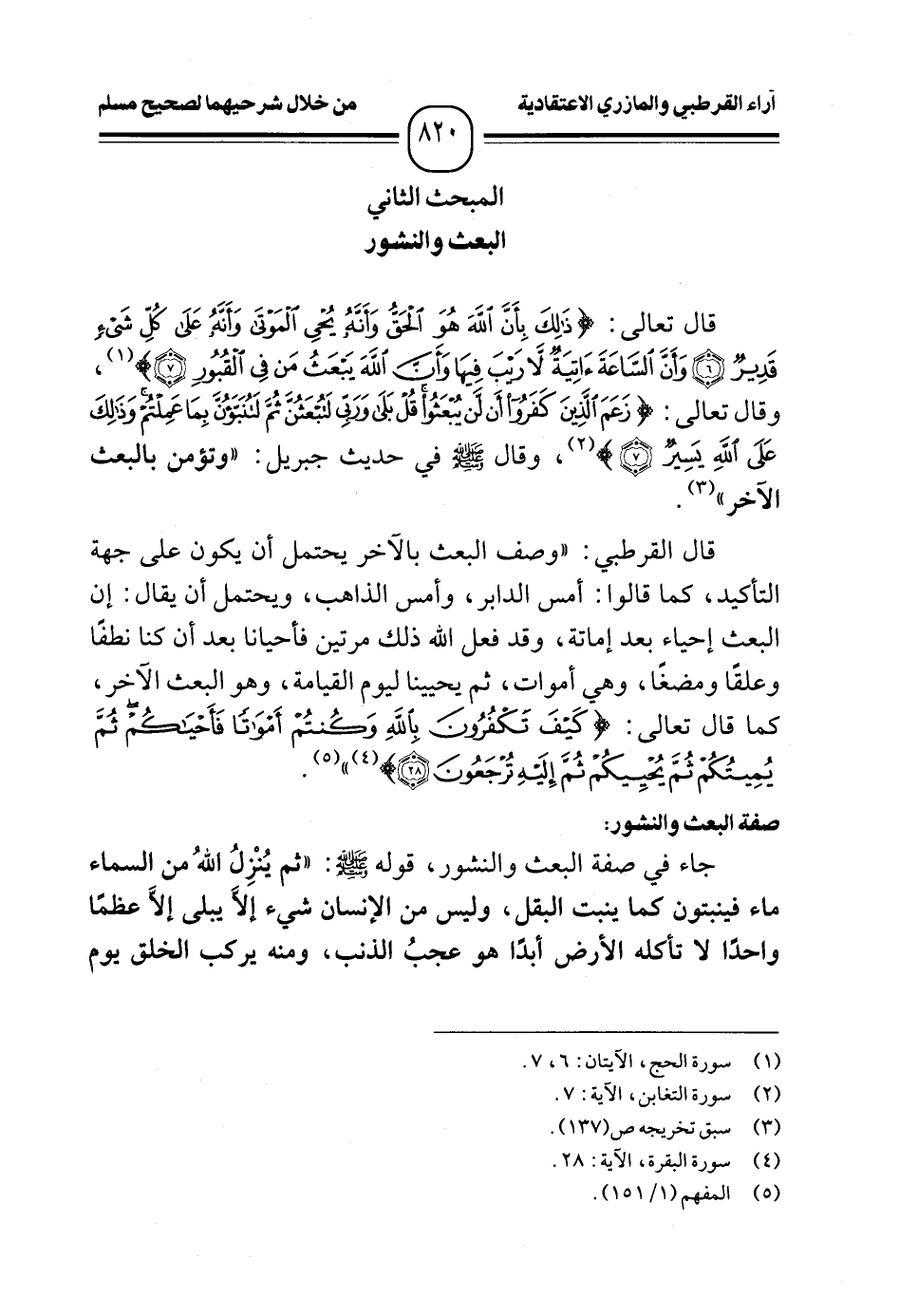قال تعالى: {ذَلِكَ بِأَنَّ اللَّهَ هُوَ الْحَقُّ وَأَنَّهُ يُحْيِ الْمَوْتَى وَأَنَّهُ عَلَى كُلِّ شَيْءٍ قَدِيرٌ (٦) وَأَنَّ السَّاعَةَ آتِيَةٌ لَا رَيْبَ فِيهَا وَأَنَّ اللَّهَ يَبْعَثُ مَنْ فِي الْقُبُورِ (٧)} (¬١)، وقال تعالى: {زَعَمَ الَّذِينَ كَفَرُوا أَنْ لَنْ يُبْعَثُوا قُلْ بَلَى وَرَبِّي لَتُبْعَثُنَّ ثُمَّ لَتُنَبَّؤُنَّ بِمَا عَمِلْتُمْ وَذَلِكَ عَلَى اللَّهِ يَسِيرٌ (٧)} (¬٢)، وقال - صلى الله عليه وسلم - في حديث جبريل: "وتؤمن بالبعث الآخر" (¬٣).