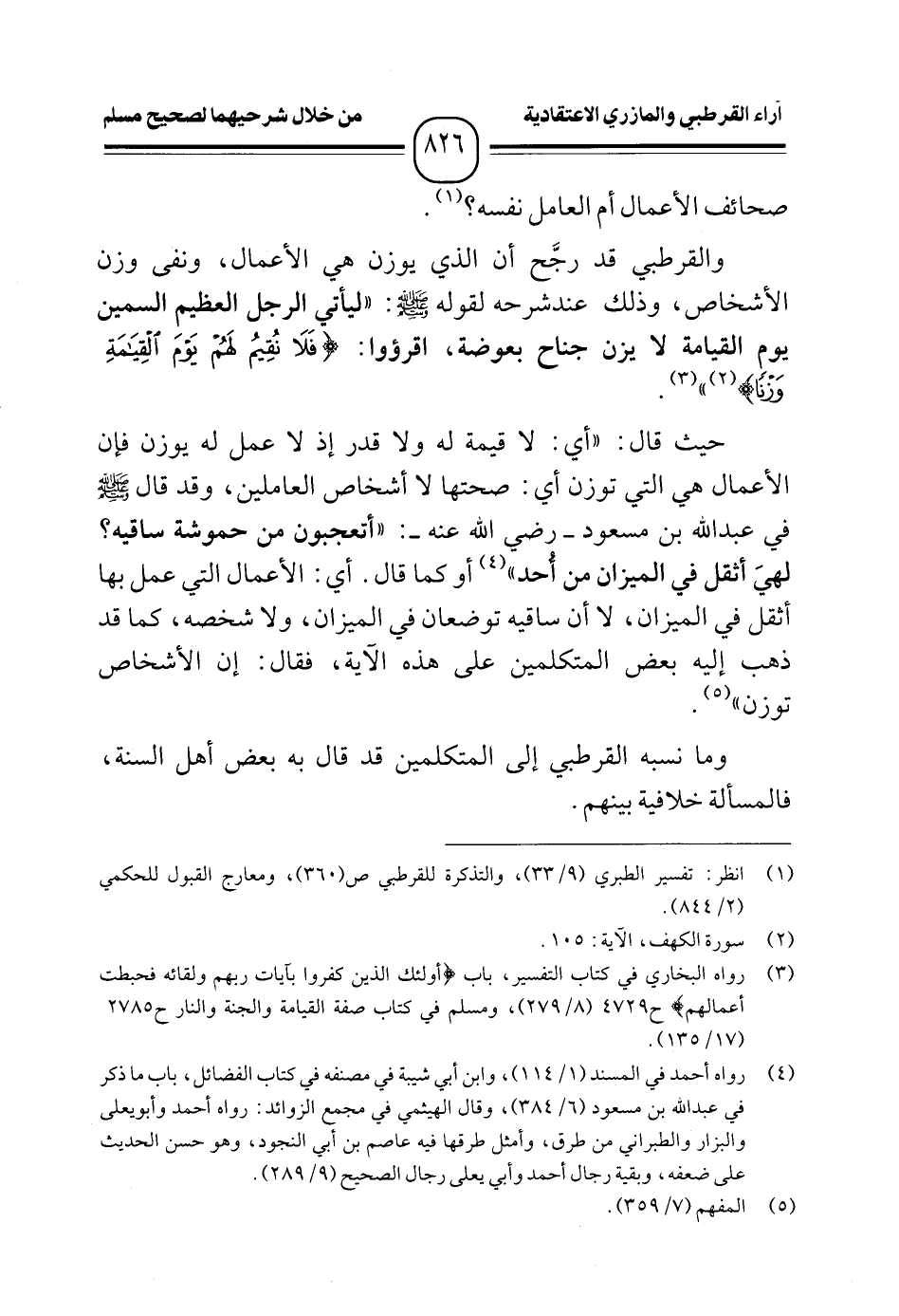 والقرطبي قد رجَّح أن الذي يوزن هي الأعمال، ونفى وزن الأشخاص، وذلك عند شرحه لقوله - صلى الله عليه وسلم -: "ليأتي الرجل العظيم السمين يوم القيامة لا يزن جناح بعوضة، اقرؤوا: {فَلَا نُقِيمُ لَهُمْ يَوْمَ الْقِيَامَةِ وَزْنًا} (¬٢) " (¬٣).