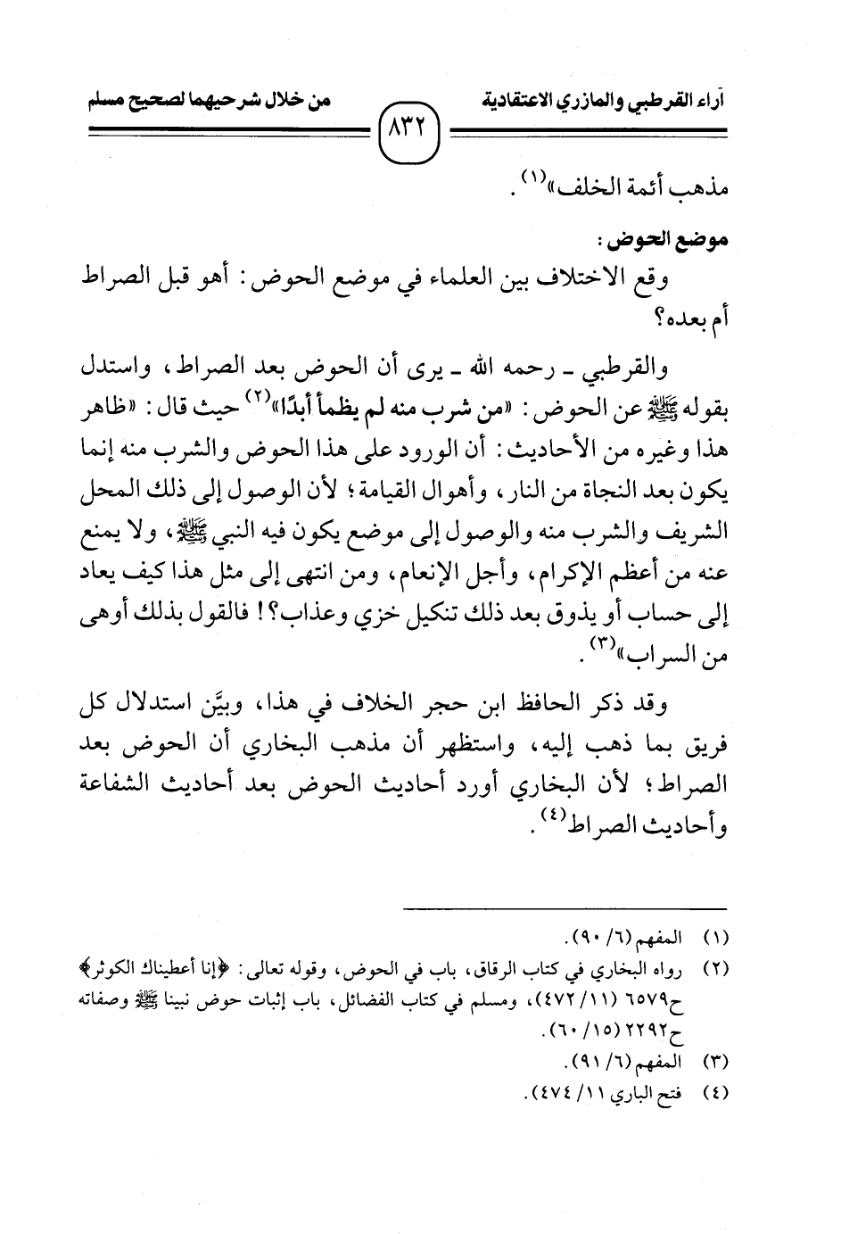 والقرطبي - رحمه الله - يرى أن الحوض بعد الصراط، واستدل بقوله - صلى الله عليه وسلم - عن الحوض: "من شرب منه لم يظمأ أبدًا" (¬٢) حيث قال: "ظاهر هذا وغيره من الأحاديث: أن الورود على هذا الحوض والشرب منه إنما يكون بعد النجاة من النار، وأهوال القيامة؛ لأن الوصول إلى ذلك المحل الشريف والشرب منه والوصول إلى موضع يكون فيه النبي - صلى الله عليه وسلم -، ولا يمنع عنه من أعظم الإكرام، وأجل الإنعام، ومن انتهى إلى مثل هذا كيف يعاد إلى حساب أو يذوق بعد ذلك تنكيل خزي وعذاب؟ ! فالقول بذلك أوهى من السراب" (¬٣).