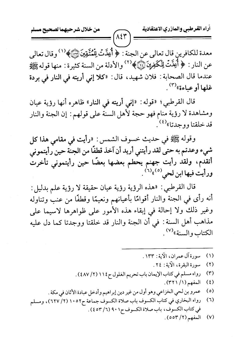 قال القرطبي؛ "قوله: "إني أريته في النار" ظاهره أنها رؤية عيان ومشاهدة لا رؤية منام فهو حجة لأهل السنة على قولهم: إن الجنة والنار قد خلقتا ووجدتا" (¬٤).