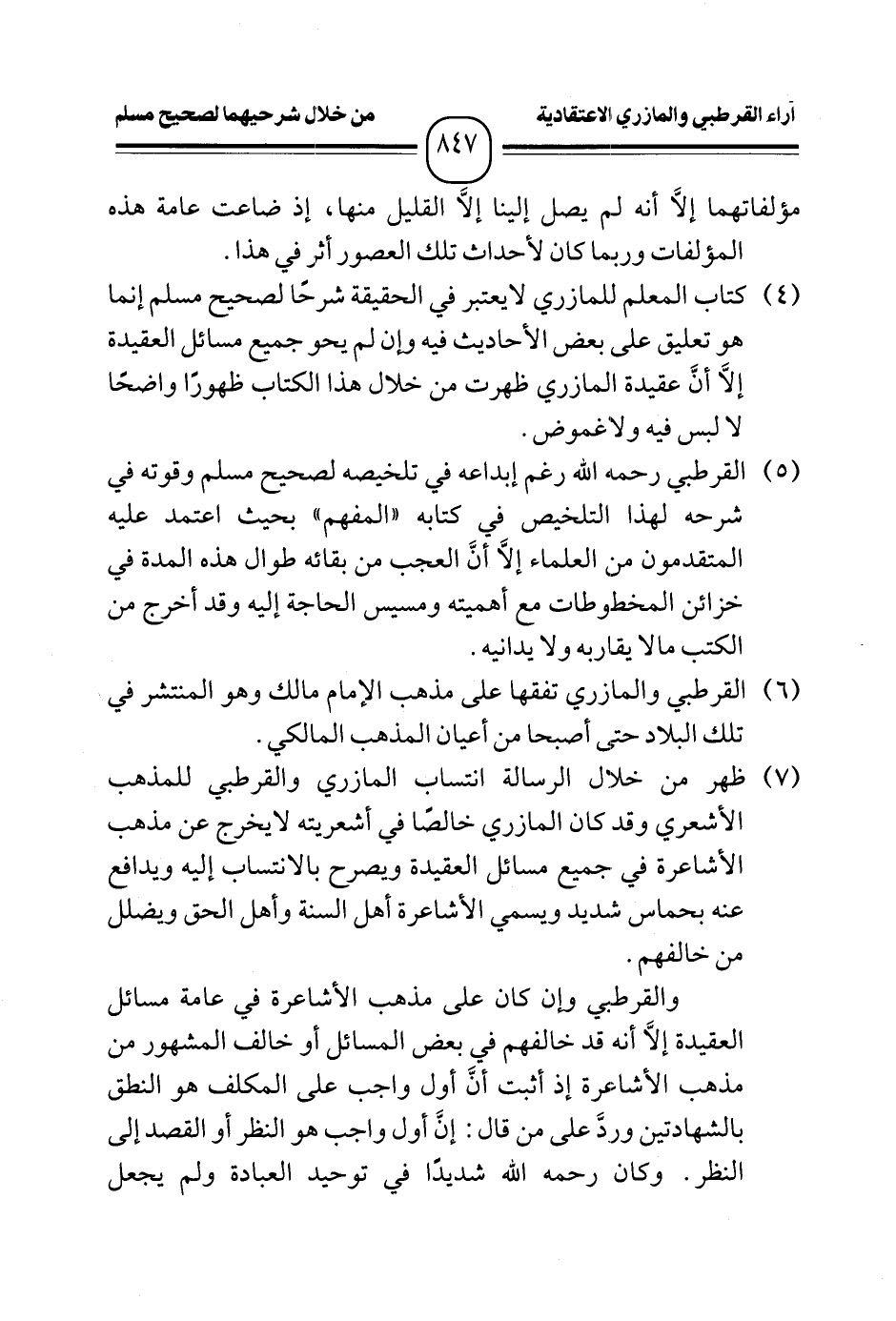 (٤) كتاب المعلم للمازري لا يعتبر في الحقيقة شرحًا لصحيح مسلم إنما هو تعليق على بعض الأحاديث فيه وإن لم يحو جميع مسائل العقيدة إلَّا أنَّ عقيدة المازري ظهرت من خلال هذا الكتاب ظهورًا واضحًا لا لبس فيه ولا غموض.