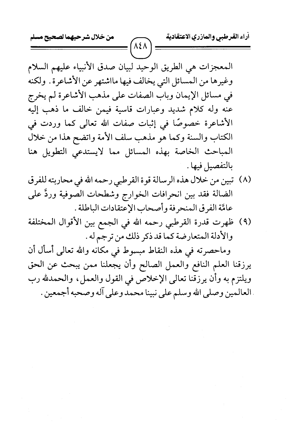 (٨) تبين من خلال هذه الرسالة قوة القرطبي رحمه الله في محاربته للفرق الضالة فقد بين انحرافات الخوارج وشطحات الصوفية وردَّ على عامَّة الفرق المنحرفة وأصحاب الإعتقادات الباطلة.